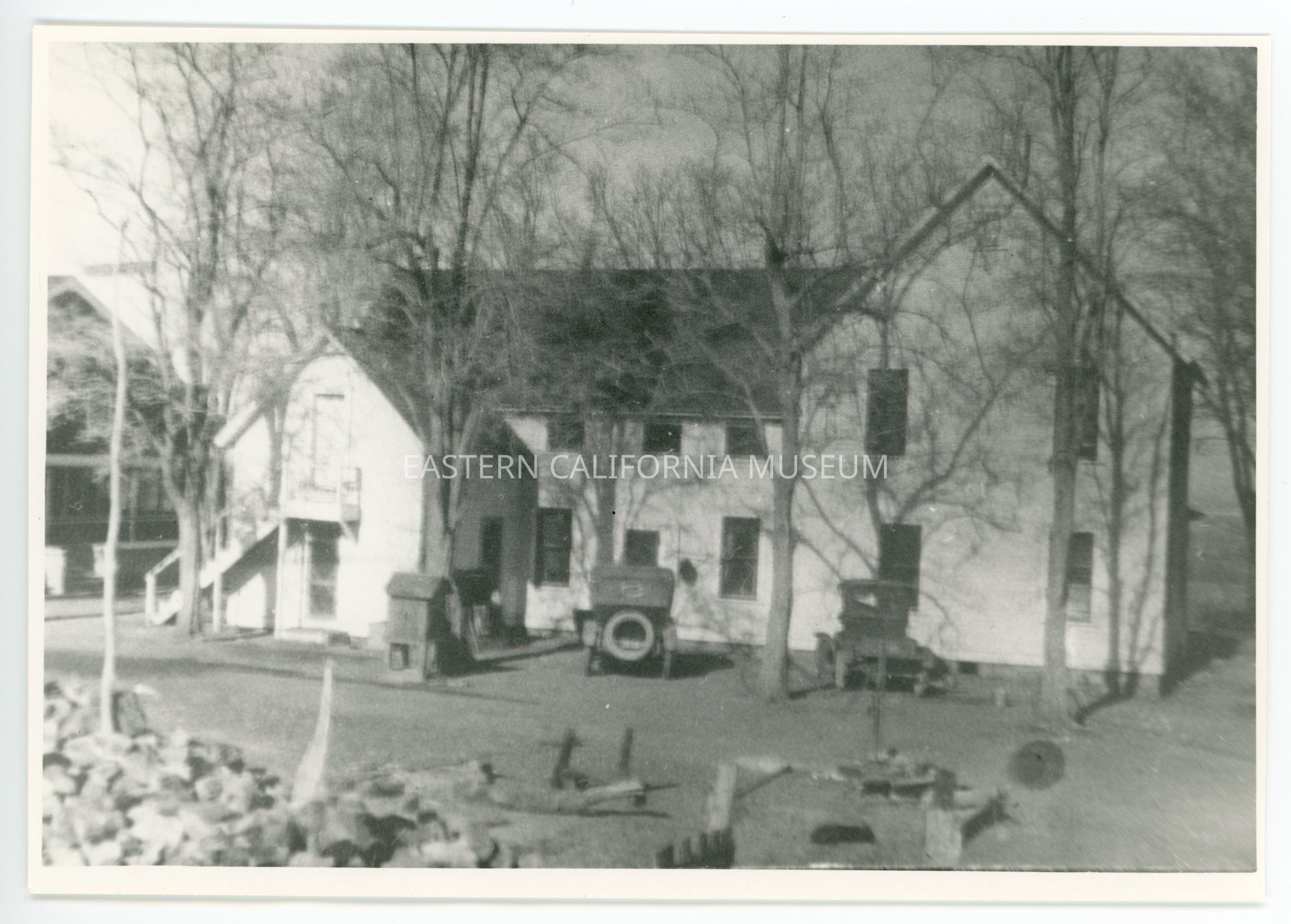 Copy of a photo of a two story building that has been identified as the Inyo County Hospital in Big Pine in 1921. There are two early automobiles parked in front of it, and possibly a pile of logs/firewood in the lower left corner. A second building is barely visible along the left side.Photograph Details