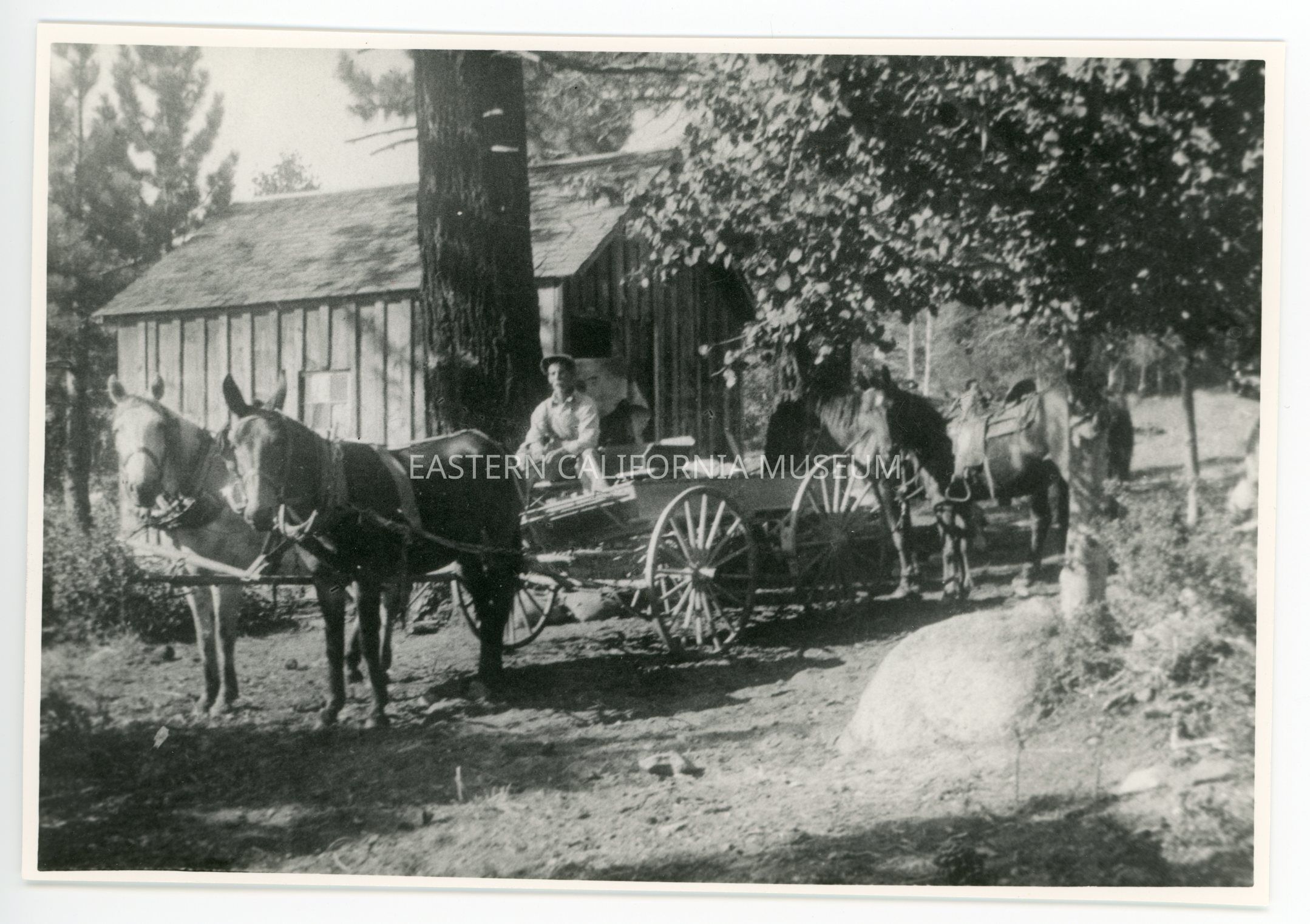 Copy of a photo of a man sitting on a horse-drawn wagon. There is another saddled horse behind the wagon and also a small wood building (cabin?) in the background.
