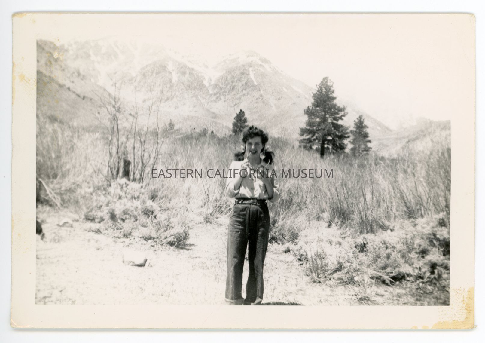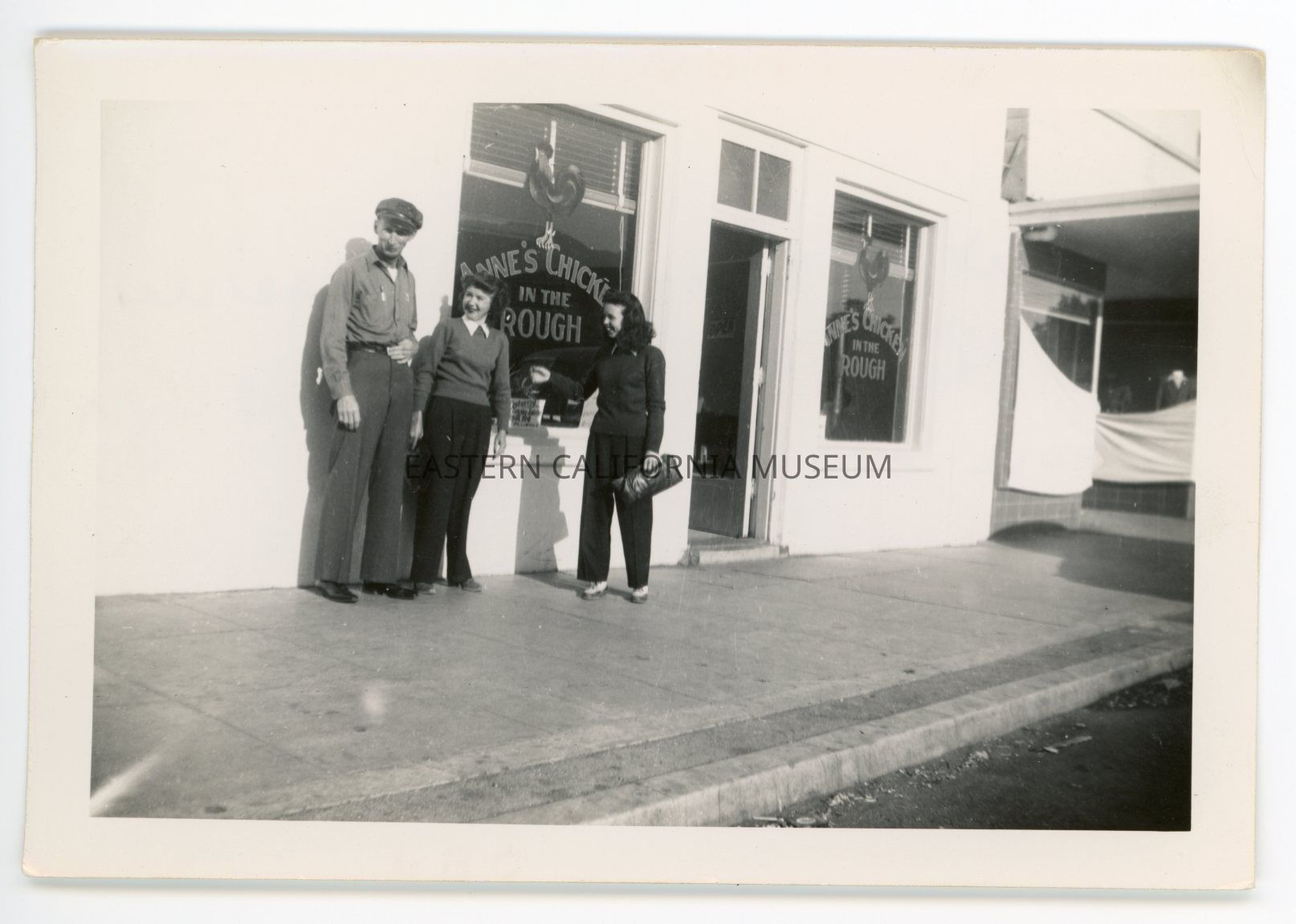 2000.5.6--"Just a couple of characters in Lone Pine. Did you ever eat there." Shows three people standing in front of "Anne's Chicken in the Rough" restaurant.