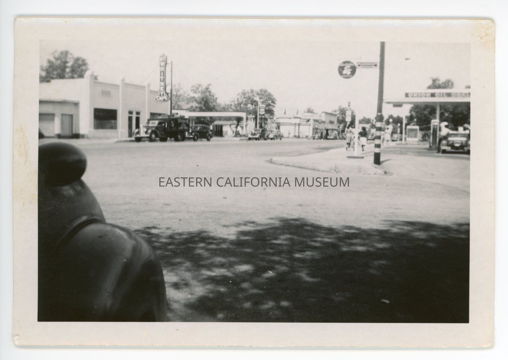 2000.5.7--"Does this look familiar? Taken from Dow Hotel." Shows Lone Pine's Main Street, automobiles, the Mt. Whitney Cafe, a couple of gas stations, and what might be the Joseph's grocery store.