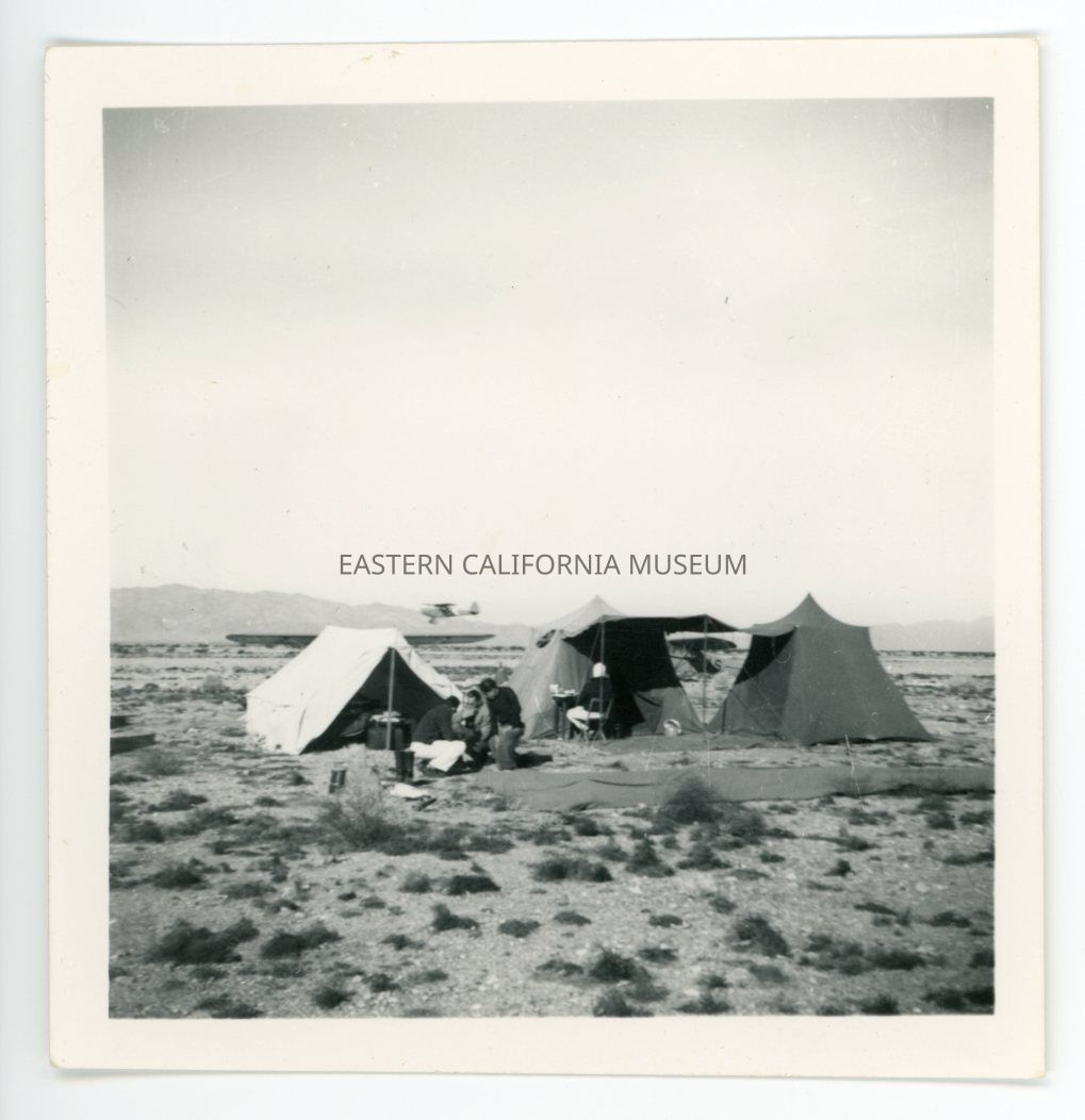 2000.5.8--Photo of three tents, three or four people around the campsite, and a plane flying low in the background. There might be one or two planes parked behind the tents (wings are visible).