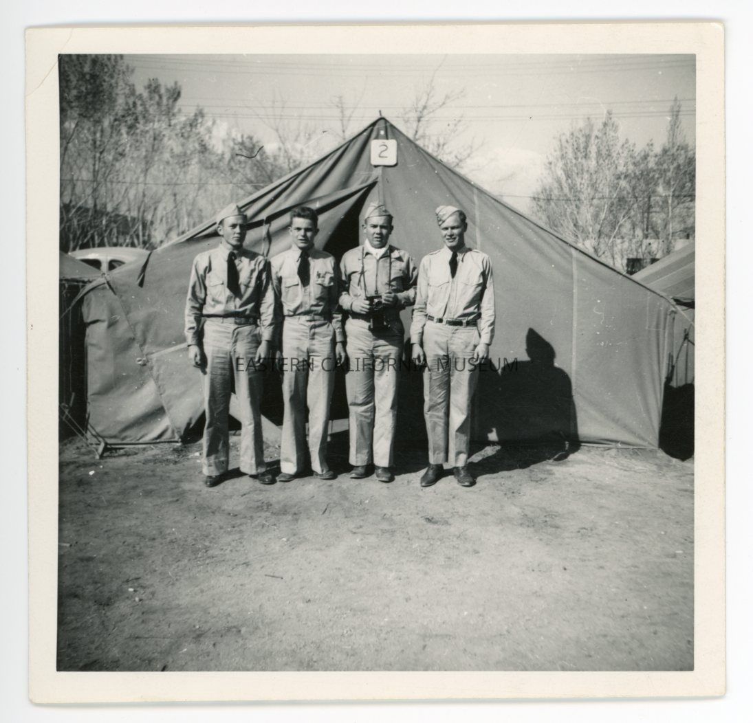 2000.5.10--Photo of four unidentified men in uniform standing in front of tent #2.