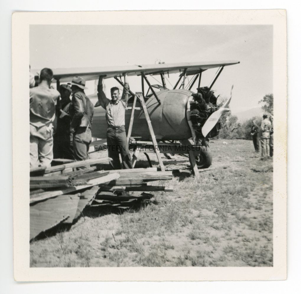 2000.5.11--Photo of several men examining a plane wreck. This plane, while damaged, is still mostly intact.