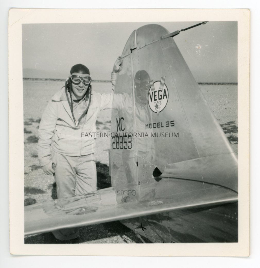 2000.5.23--Photo of a pilot wearing a cap and goggles standing next to the tail of a plane. It is a Vega Model 35, NC 28353.