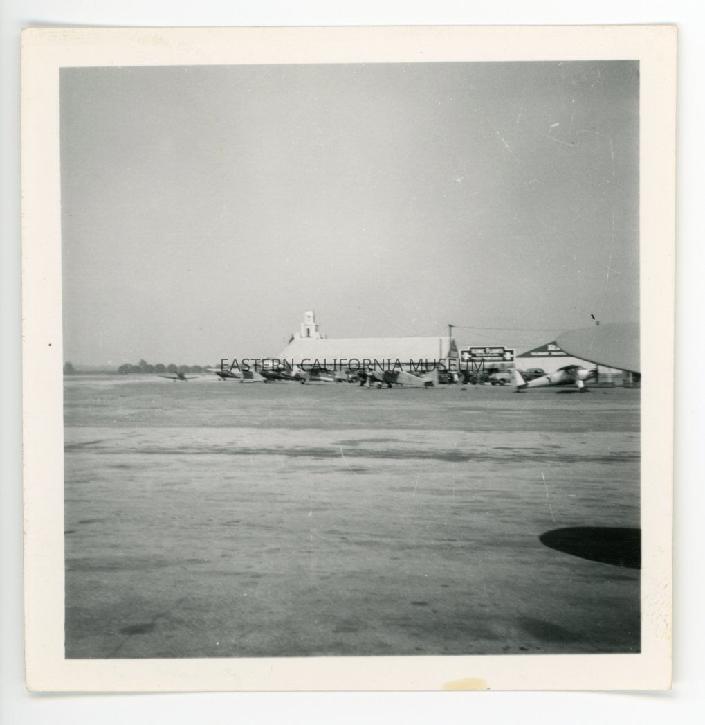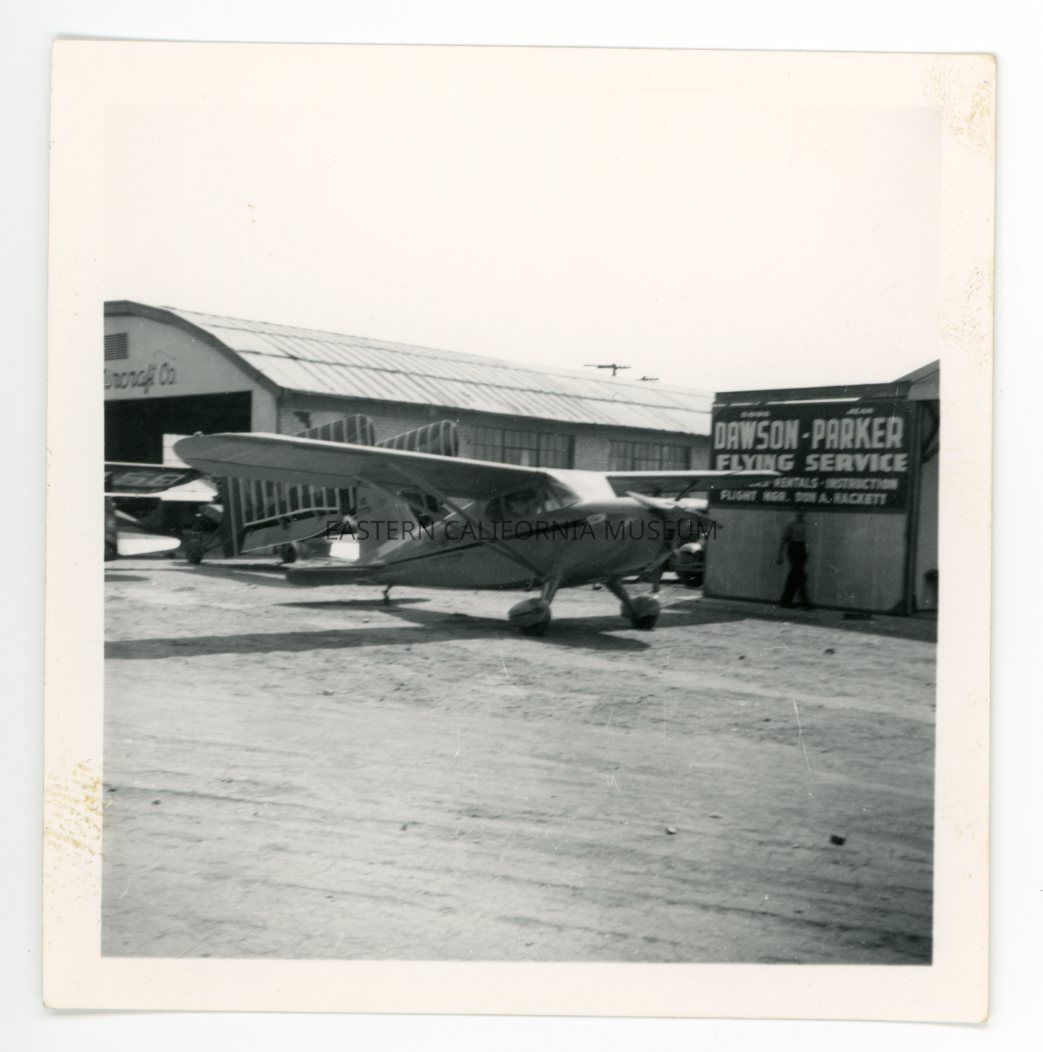 2000.5.25--Photo of a plane parked in front of a sign for "Dawson-Parker Flying Service. [illegible] rentals, Instruction. Flight Mgr. Don A. Hackett." There is a large hanger to the left side with a sign that says, "---craft Co." The Dawson-Parker Flying Service opened in September 1941 and operated out of the Palm Springs Airport.Photograph Details