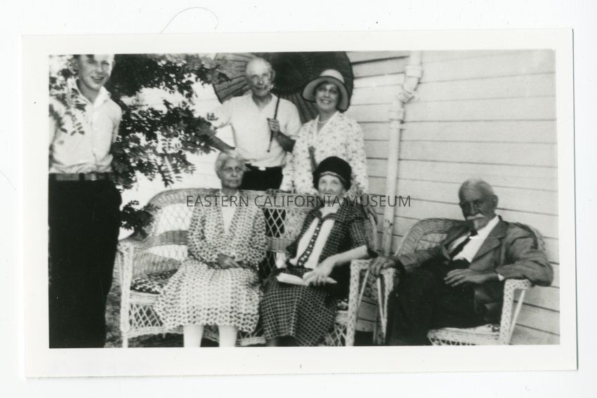 Info on archival envelope: Album caption: Family group, Bartlett, July 1929. Left to right standing: John Houghton, Don Houghton, Mirrie Houghton. Sitting: E. A. Plampin, Mrs. Edwin Houghton, Charles Houghton.Photograph Details