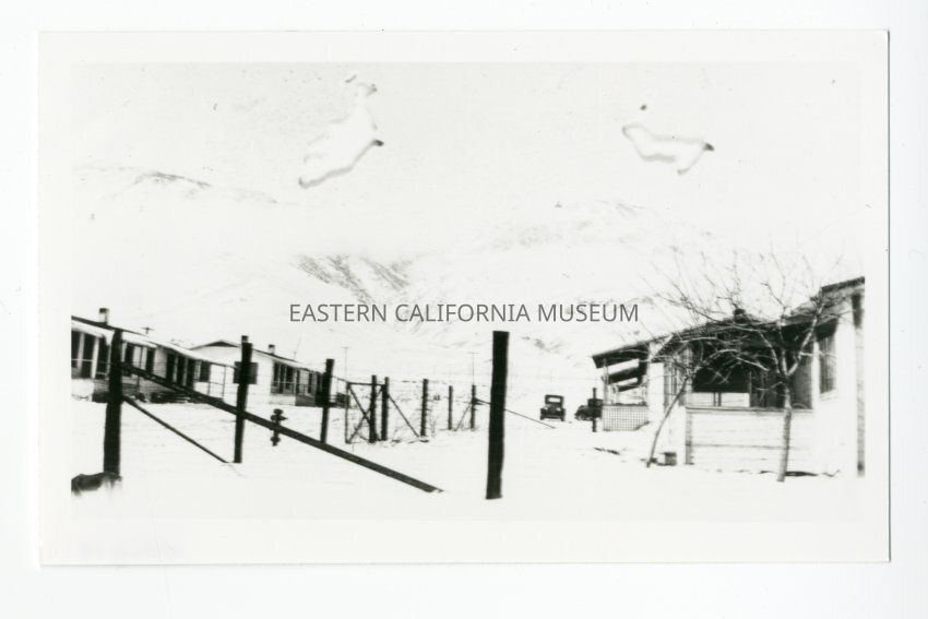 Copy of a photo of houses, fences, and two automobiles. There is a layer of snow on the ground and on the mountains in the background.