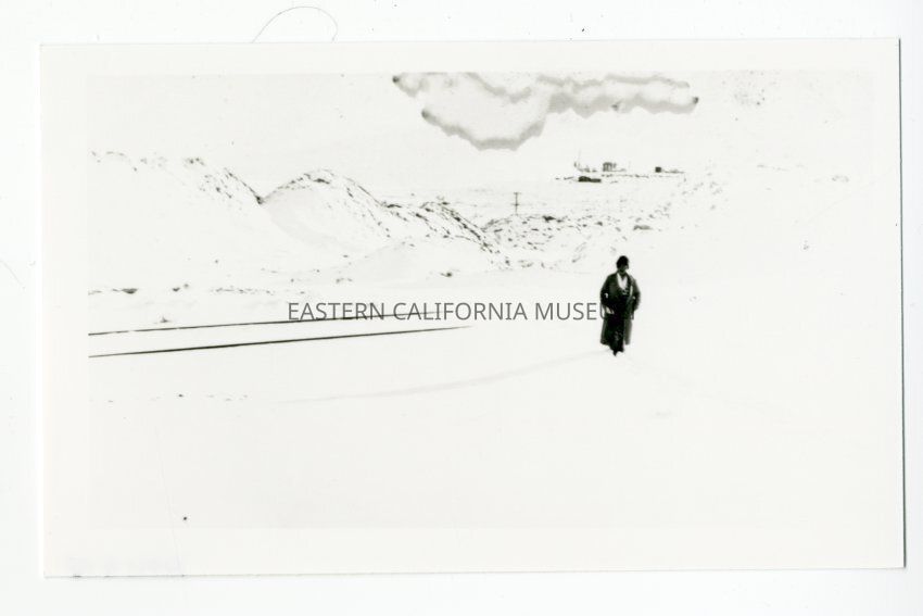 Copy of a photo of a person standing outside in snow.