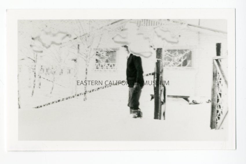 Copy of a photo of a person standing in front of a house. There is a thick layer of snow on the ground. Location has been identified as Bartlett.