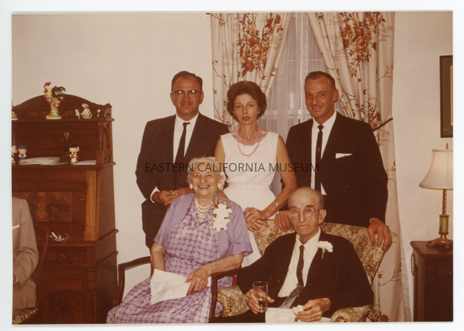 1990.26.139a--Color photo taken on Victor Hough's parents' 50th wedding anniversary, 08/13/1963. Pauline Hough (79 years), Edward Hough (84 years), Victor Hough (47 years), Bertha Burkhard (48 years), and Edward Hough (39 years).