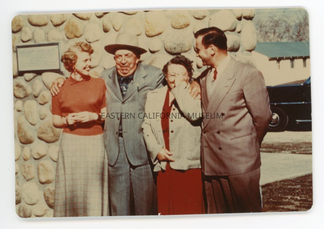 1990.26.139e--Color photo of Mary Lou Gant Rowan, John Lubken (Inyo County Supervisor for Lone Pine), Helena Little (Director of Public Health), and Victor H. Hough (Inyo County Healthy Officer). They may be standing in front of the Inyo County Health Department in Independence in 1952.Collection