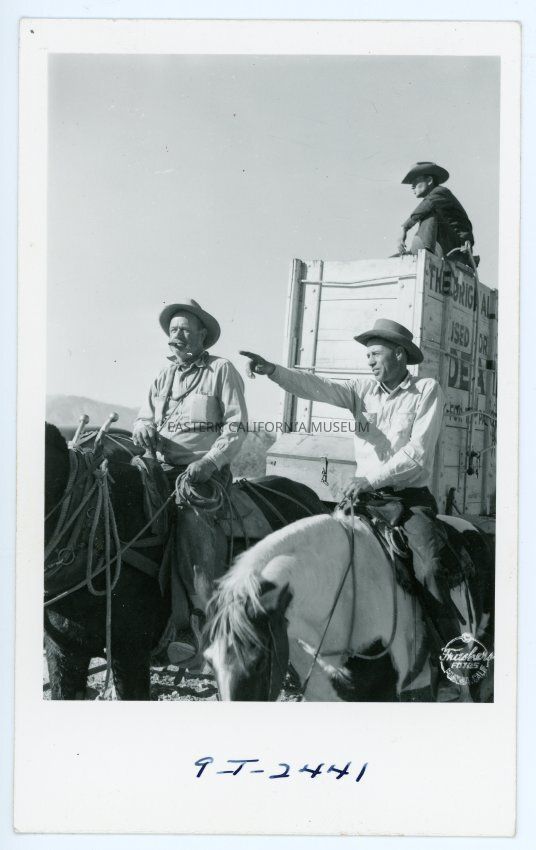 Photo postcard of three men, two on horses and one riding the top of the borax wagon. Uncertain if one of the men is Russ Spainhower, the 20 mule team driver, or Bruce Morgan. The side of the wagons (not entirely legible in this photo) say, "The original 20 mule team wagon used for hauling borax out of Death Valley for the Pacific Coast Borax Co."