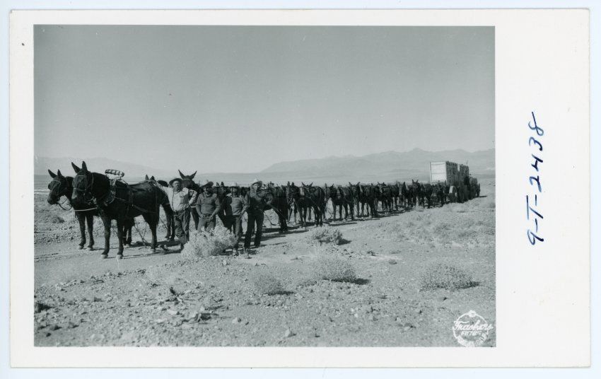 Photo postcard of a 20 mule team hualing two borax wagons through the desert. Four men are posed next to the stopped mules, the first of which has freight bells. One of the men is almost certainly Russ Spainhower or Bruce Morgan.