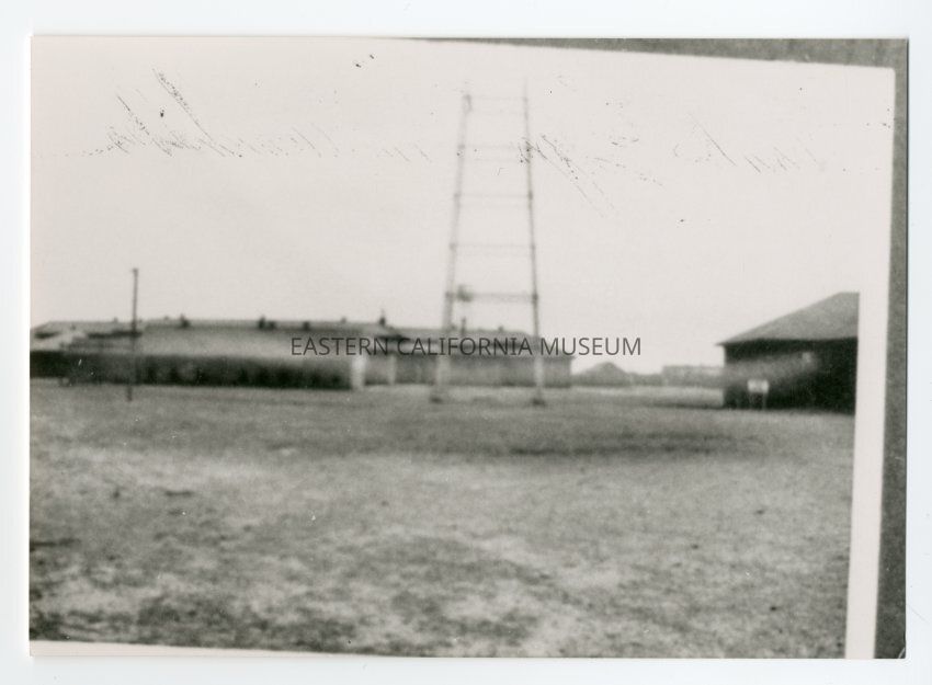 Out of focus photo of buildings and part of a tower (radio?). It may be the inmates' sleeping quarters at Leupp, AZ.