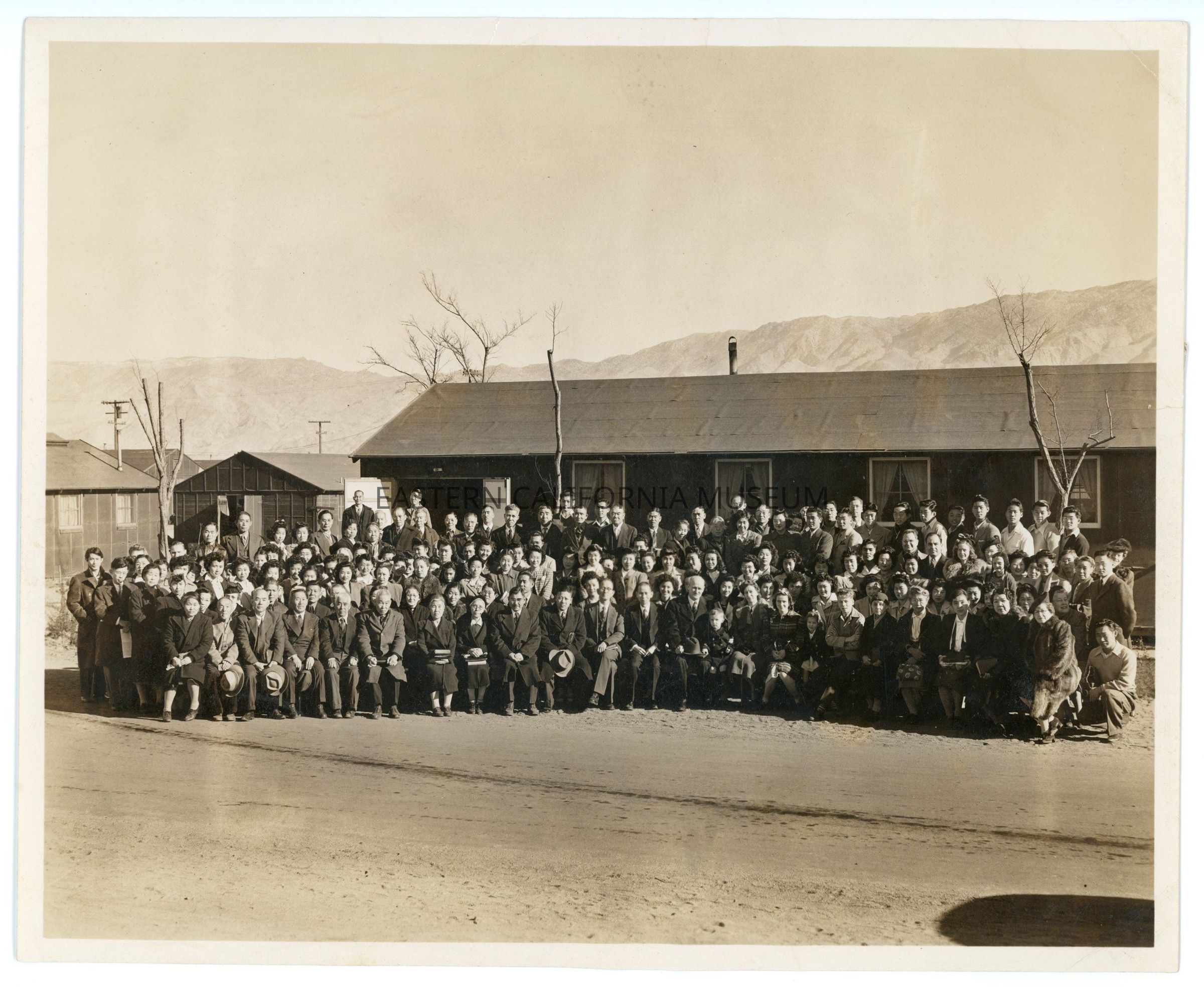 Photo of a large group of people posing in front of several barracks at Manzanar War Relocation Center. They may be congregation members of the Protestant Church.Collection
