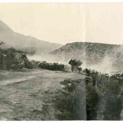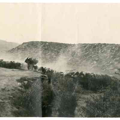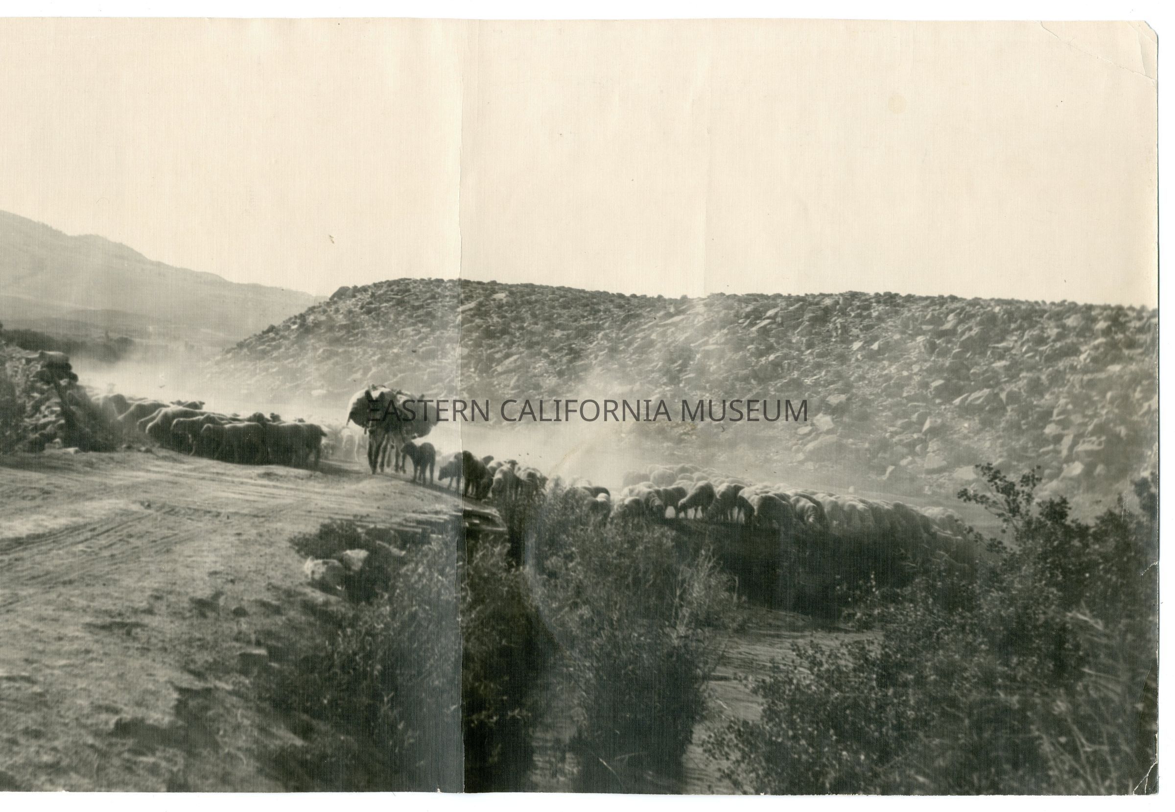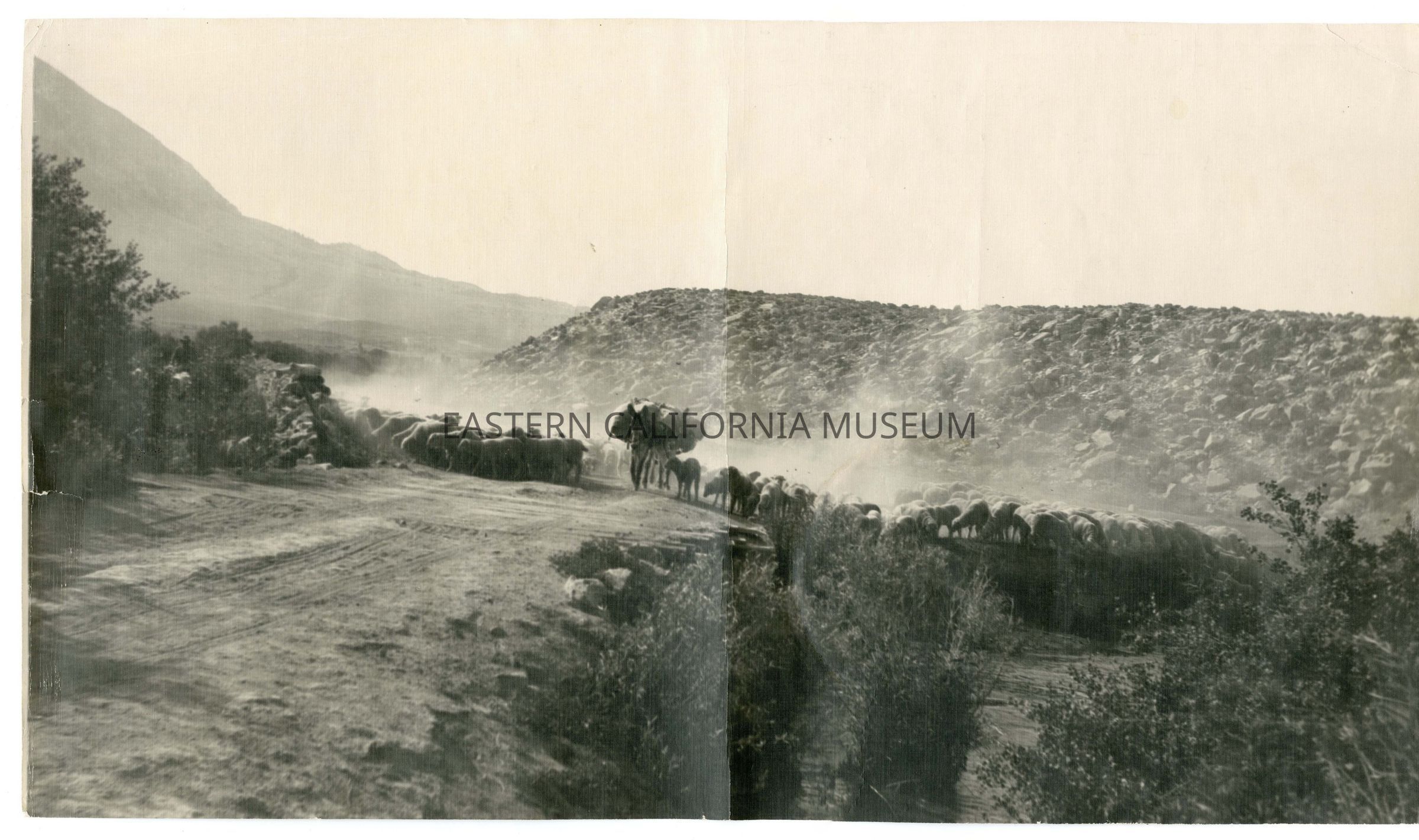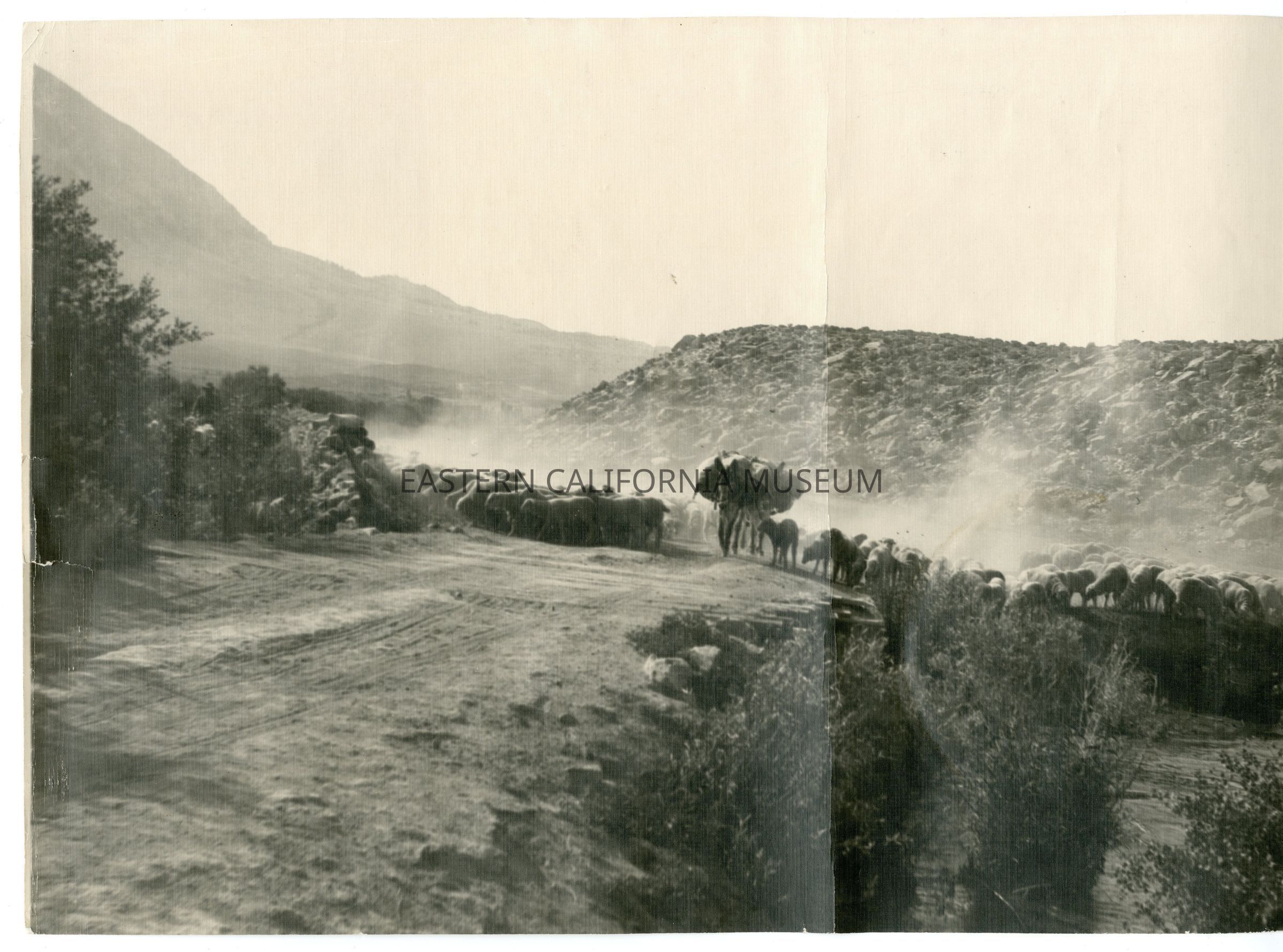Panorama photo of a flock of sheep along a dirt road. There are a few loaded pack mules walking down the middle of the road. Written in pencil on reverse: Round Valley.