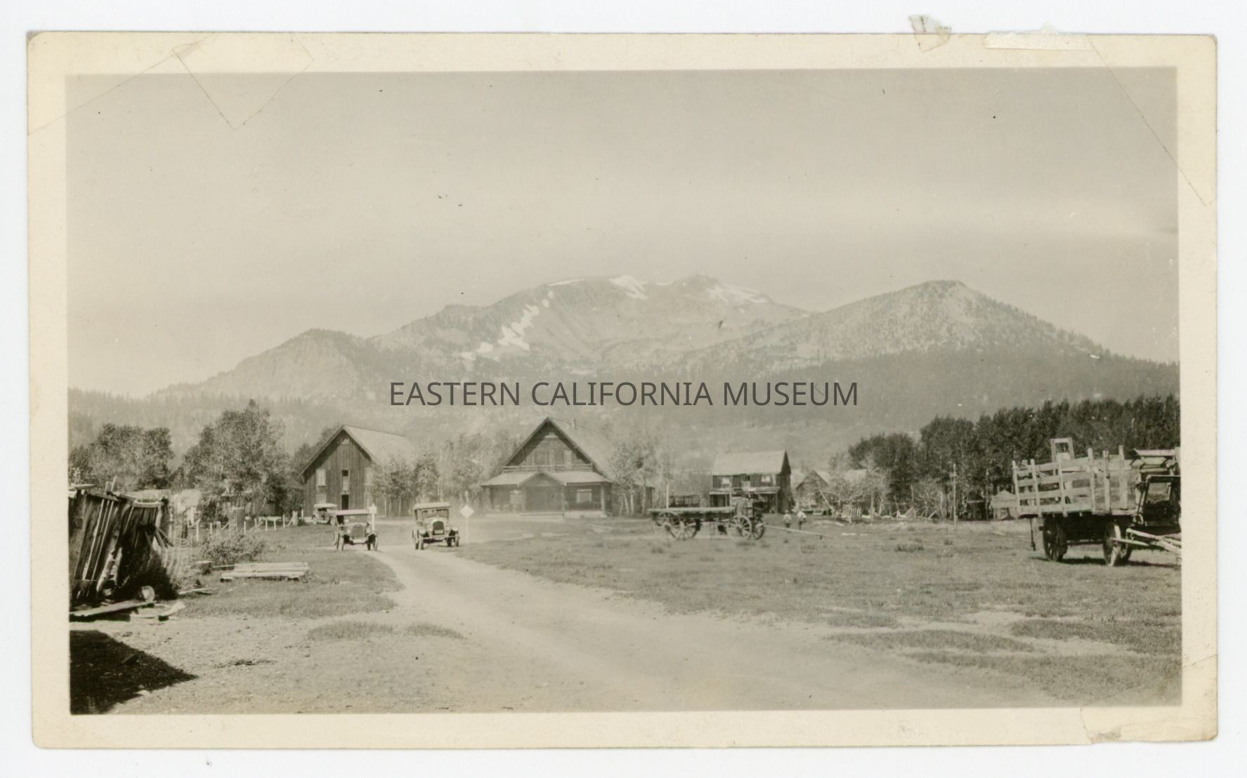 Typewritten note in envelope: This is Mammoth Camp, a resort built and operated by the Charles Summers family from about 1917-1927 when it burned. Mammoth Mountain is in background. Location: meadows of present Old Mammoth. Buildings are left to right: Rooming house, Hotel with dining room. Old Wildasinn Hotel may date from before 1900. Summers bought most of Wildasinn homestead in 1917. Any other information can be obtained from Genny Schumacher Smith.Photograph Details
