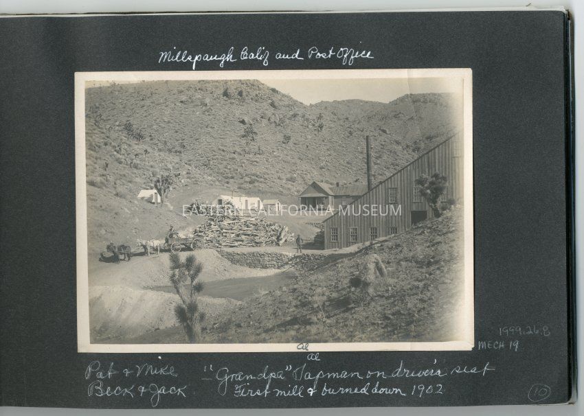 Caption on album page: Millspaugh Calif. and Post Office. Pat and Mike, Beck and Jack, "Grandpa" Tapman on driver's seat. First mill, burned down 1902.Collection