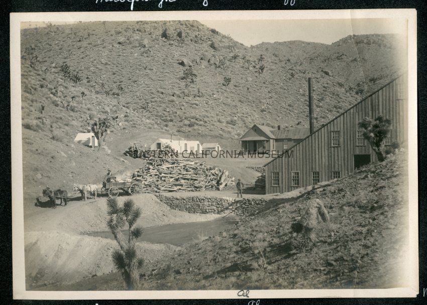 Photo of the mill in Millspaugh mining camp. There are a couple white canvas tents and one wooden structure. There is a large pile of yucca trees, a wagon, and a man standing by a stone retaining wall. One man was identifed in ink along the bottom edge of the photo as "Al."
