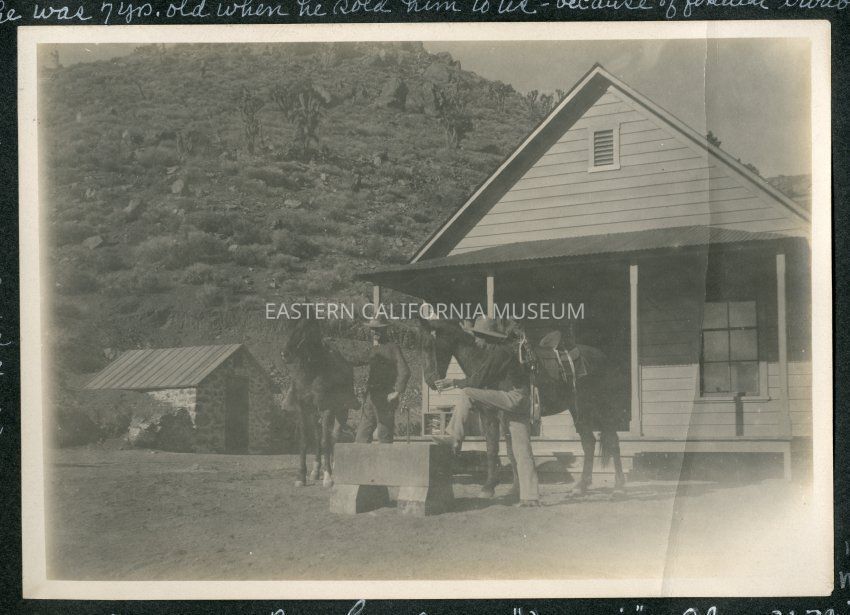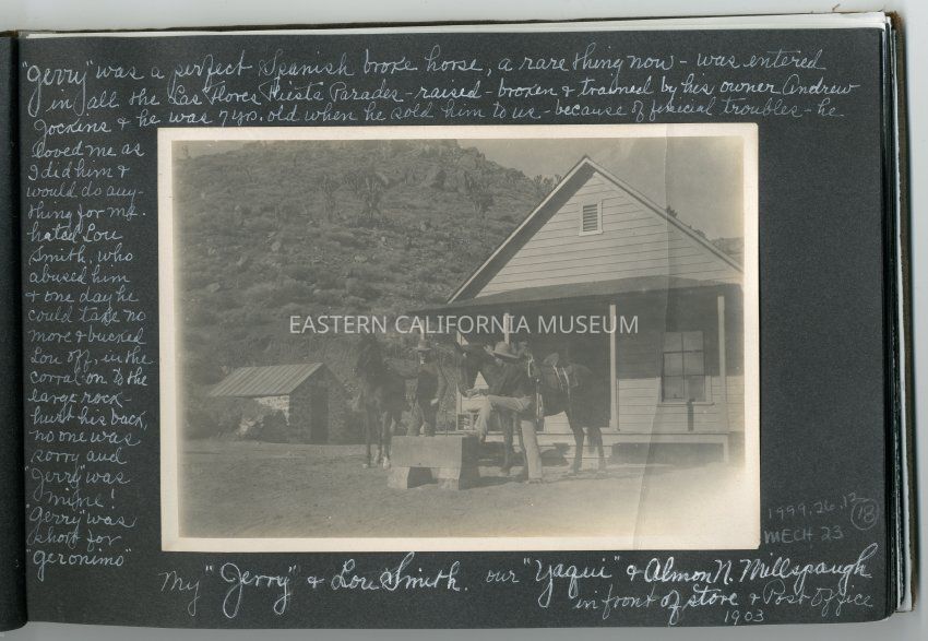Caption on album page: My "Jerry" and Lou Smith. Our "Yaqui" and Almon N. Millspaugh in front of sotre and post office, 1903. "Jerry" was a perfect Spanish broke horse, a rare thing now--was entered in all of the Las Flores Fiesta parades--raised--broken and trained by his owner Andrew Gockine and he was 7 years old when he sold him to us--because of finicial [financial] troubles--he loved me as I did him and would do anything for me. Hated Lou Smith, who abused him and one day he could take no more and bucked Lou off, in the corral on to the large rock--hurt his back, no one was sorry and "Jerry" was mine! "Jerry" was short for "Geronimo."Collection