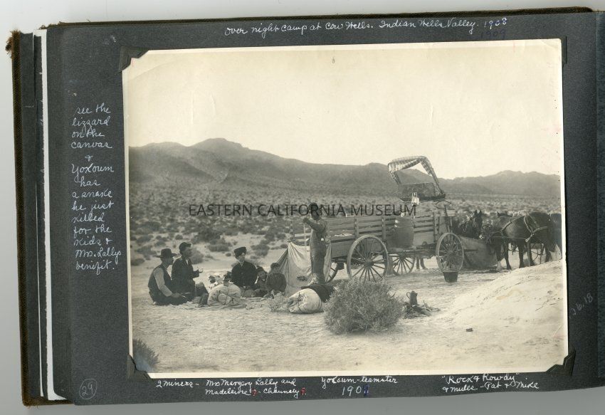 Caption on album page: Overnight camp at Cow Wells, Indian Wells Valley, 1908 [date crossed out and replaced with 1909]. See the lizzard [lizard] on the canvas and Yokoum has a snake he just killed for the kids and Mrs. Lally's benefit. 2 miners--Mrs. Margery Lally and Madeleine and Chauncey, Yokoum teamster, "Rock and Rowdy" and mules Pat and Mike.