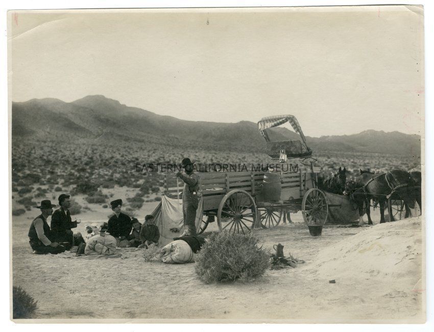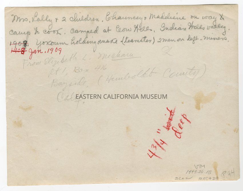 Typewritten page that goes with this photo: Mrs. Lally and two children, Chauncey and Madeliene, on way to camp to cook. Camped at Cow Wells, Indian Wells Valley, January 1909. Yokoum, a teamster, holding snake, two men on the left are miners. THis picture was selected from the album by CHarles Shelton, November 20, 1961 for the "Photo Album of Yesterday's Southwest" published by Desert Magazine, Palm Desert, California and compiled by him. "Camping Memories" -- our team and wagon, four animals. Mrs. Lally and the children, Madeliene, 6 yrs. and Chauncey, 8 yrs., were coming up to camp to cook for us, 1909-1910. If you haven't seen Shelton's Album, you should, fine pictures of our glorious days. My history, "Millspaugh, the Beginning and the En,d" is at Eastern California Museum, Independence, CA.Collection