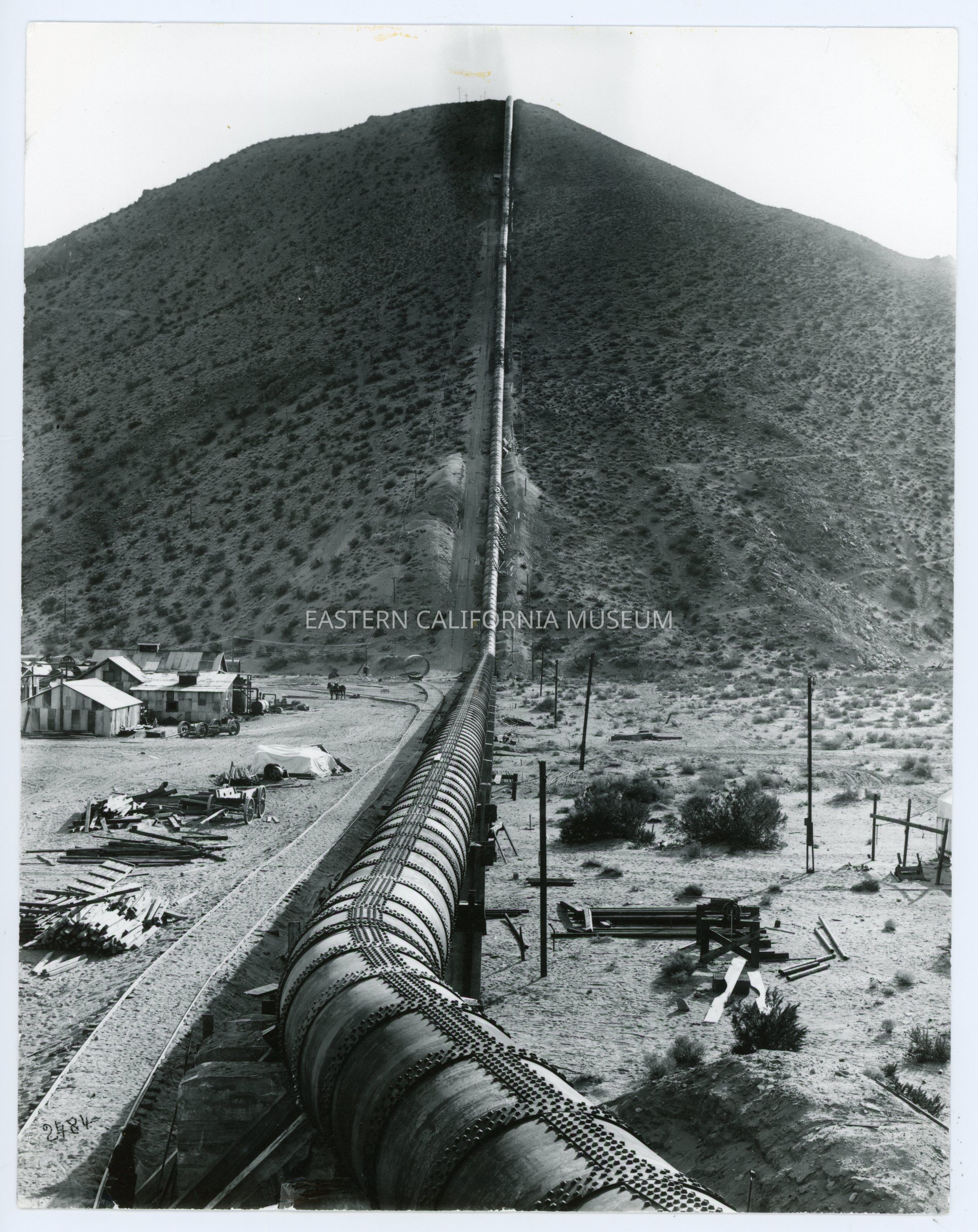 Jawbone Siphon, looking south with the construction camps on left. Rail cars hauled each section of pipe into place. Pipe varied in size from 7 1/2 feet to 10 feet. Siphons of this type comprised 12 miles of the aqueducts total length.