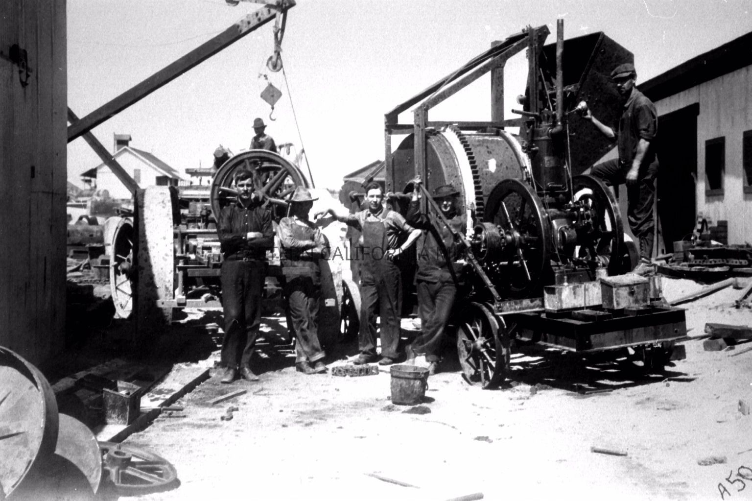 B & W digital scan of LADWP Laborers at Aqueduct Equipment Yard with unidentified Machinery, location unknown. (Laborers responsible for maintaining and repairing Machinery.)Collection