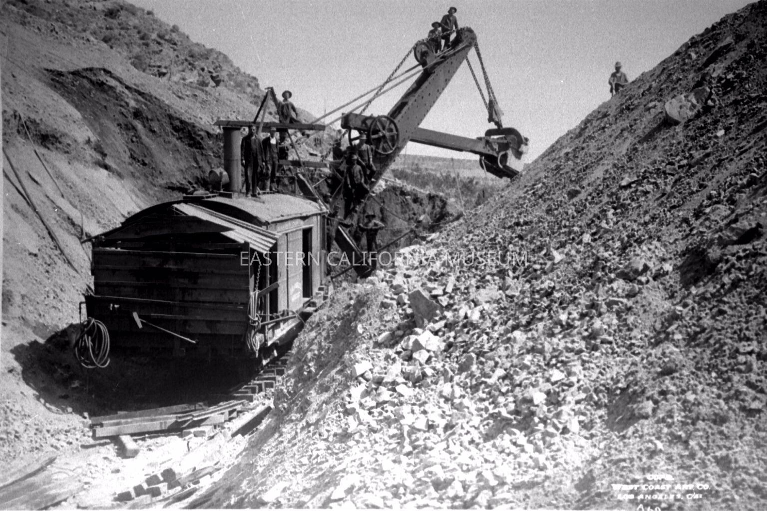B & W digital scan of Los Angeles Aqueduct Steam Shovel and Crew excavating the Open, Lined Section or Covered Conduit Section of LA Aqueduct, location Sierra foothills/ Mojave Desert. Note ties and rails under Steam Shovel enabling the beast to move forward.Collection