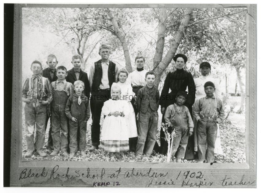 Copy of a photo of students attending the Aberdeen School, circa 1902. Written on front of photo is, "Black Rock School at Aberdeen, 1902. Jessie Harper teacher."