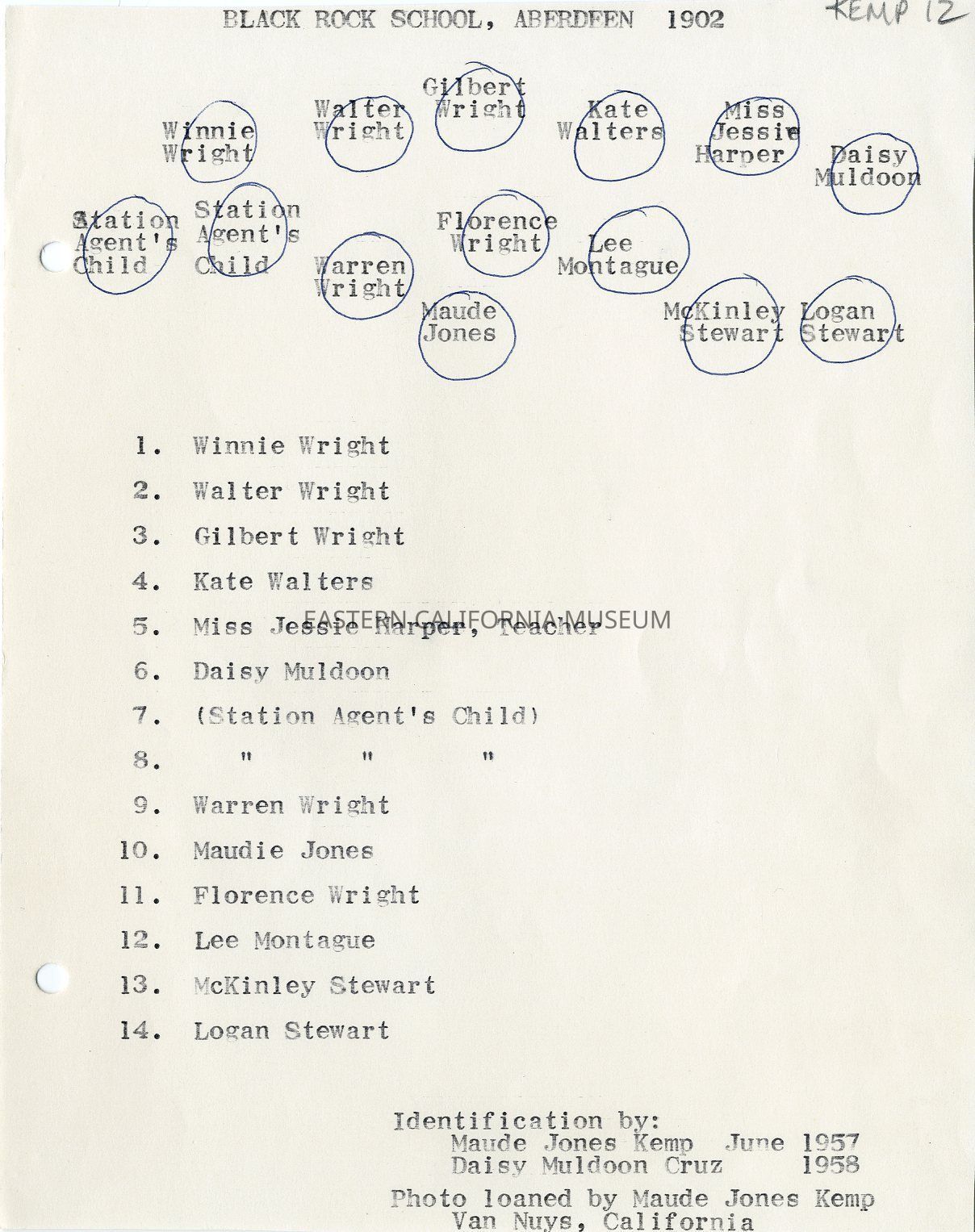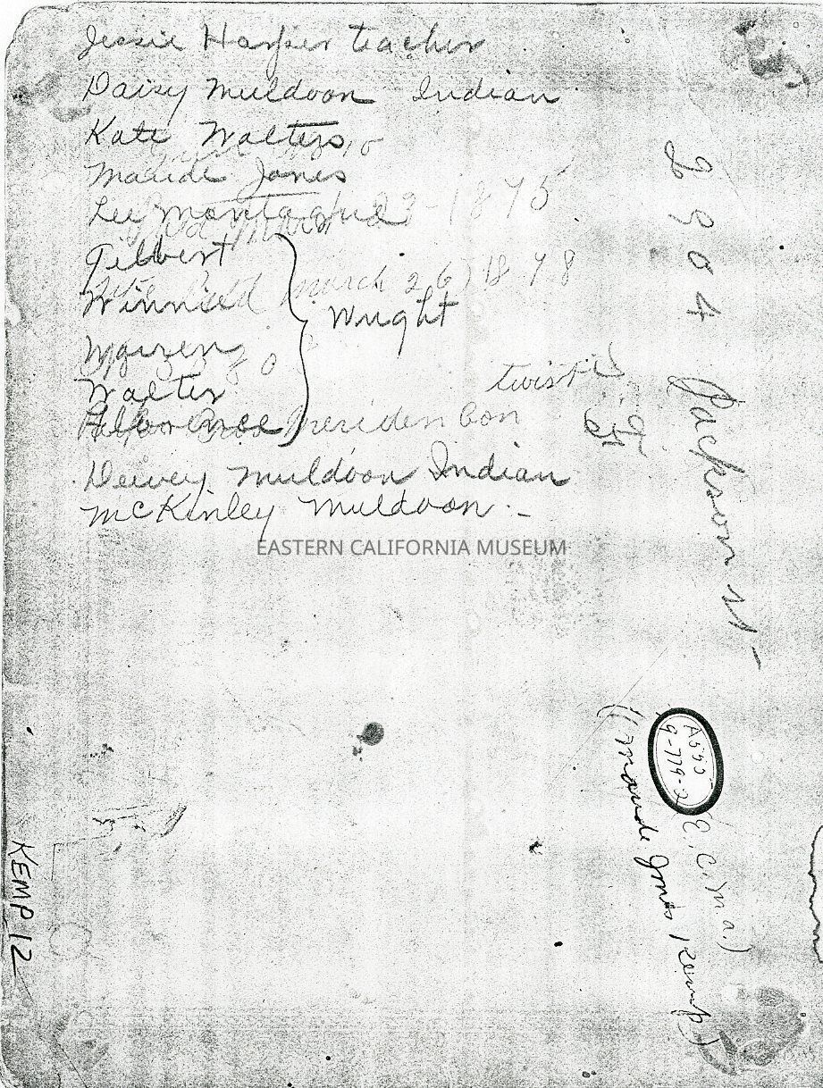 Identifications by Maude Jones Kemp in June 1957 and Daisy Muldoon Cruz in 1958: Top row (LtoR): Winnie Wright, Walter Wright, Gilbert Wright, Florence Wright (middle center), Kate Walters, Miss Jessie Harper (teacher), Daisy Muldoon Cruz (Native American). Bottom row (LtoR): Station Agent's child, Station Agent's child, Warren Wright, Maude Jones Kemp, Lee Montague, McKinley Stewart (Native American) [or McKinley Muldoon?], Logan Stewart (Native American) [or Dewey Muldoon?].Collection