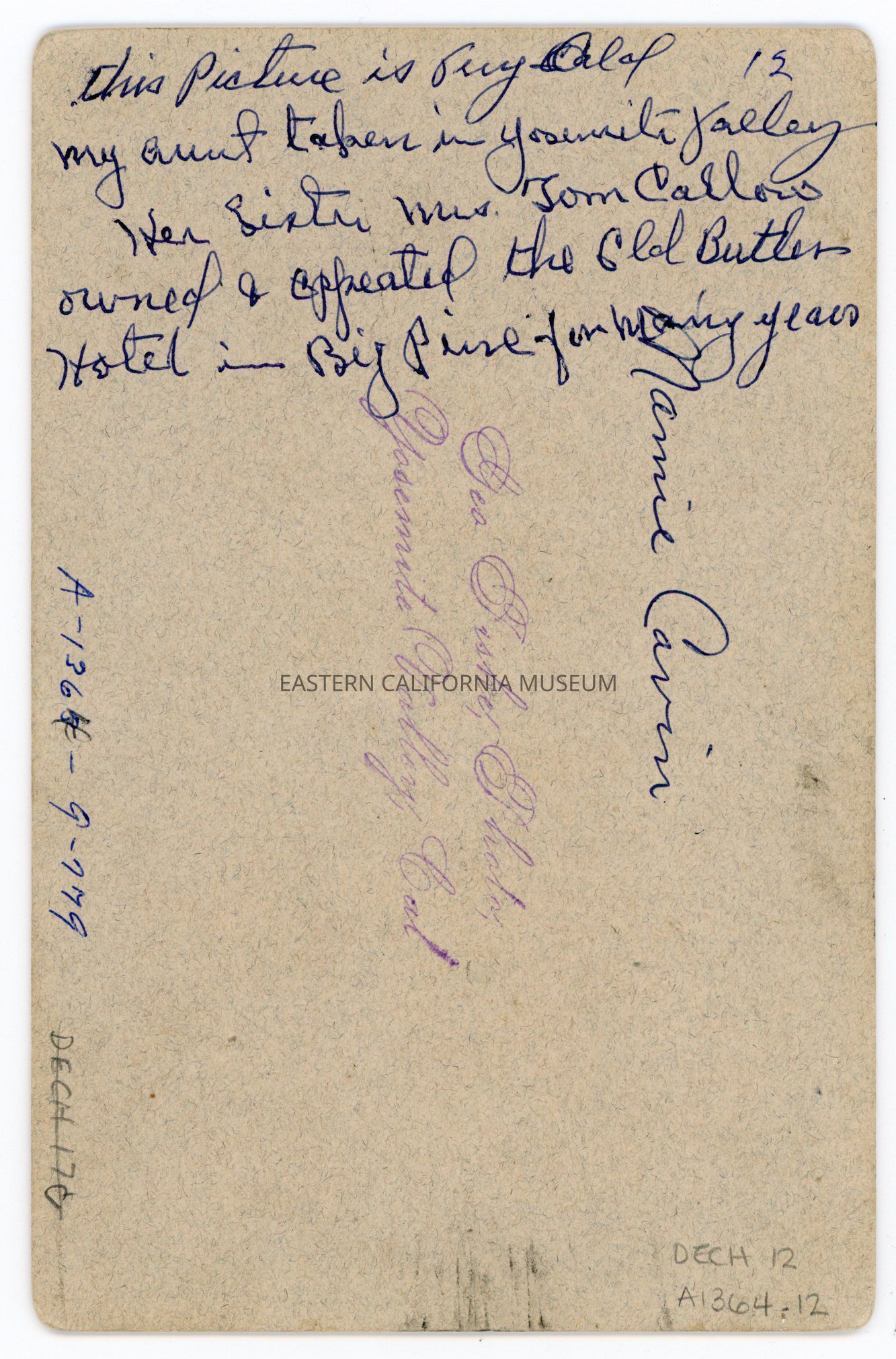 Written in blue ink on reverse: Mamie Cavin. This picture is [illegible] my aunt taken in Yosemite Valley. Her sister Mrs. Tom Callow owned and operated the old Butler Hotel in Big Pine for many years.