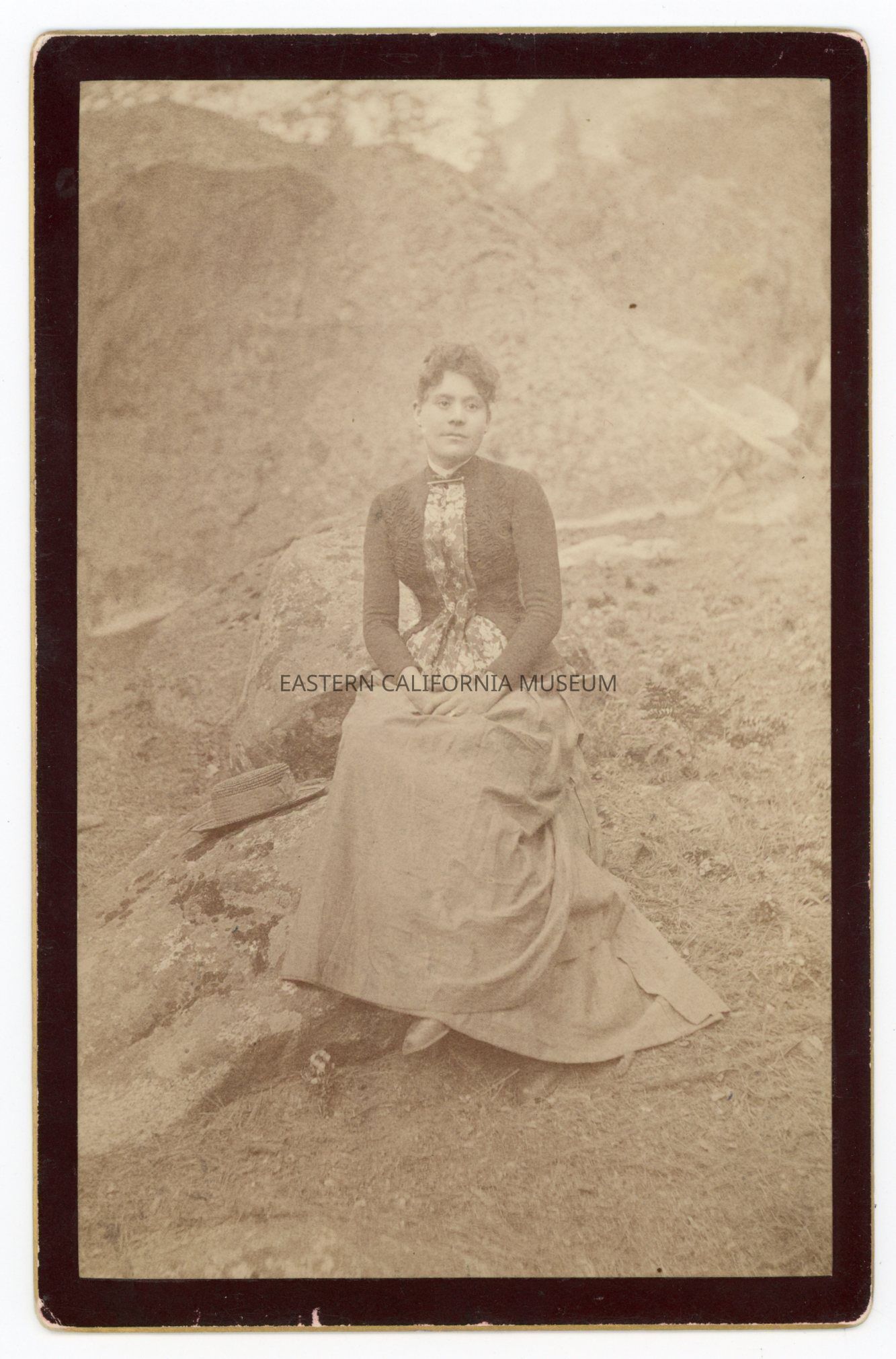Mounted photo of a young woman sitting on a boulder with her hat resting beside her. The photographer was George Fiske of Yosemite Valley.