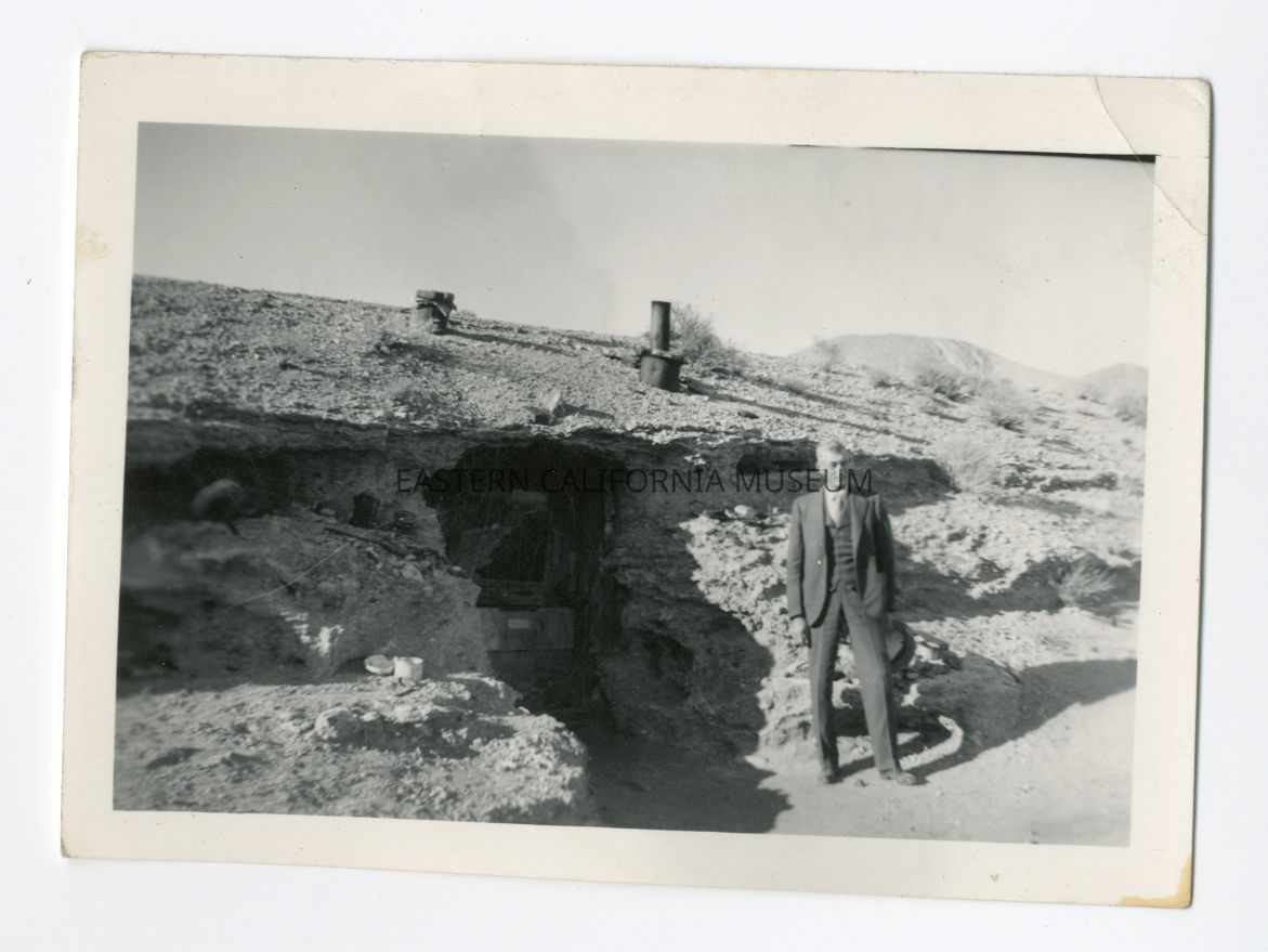 Exterior photo of a man standing beside a cave dwelling. There is a door and several pipes/vents sticking out of the roof.