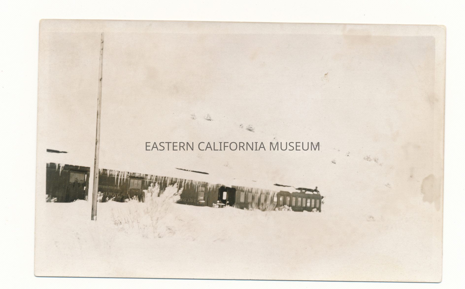 Photo postcard of a train in a snowy landscape. One of the cars is a baggage car, and another car with many windows is likely a passenger car. There are enormous icicles hanging down the sides.