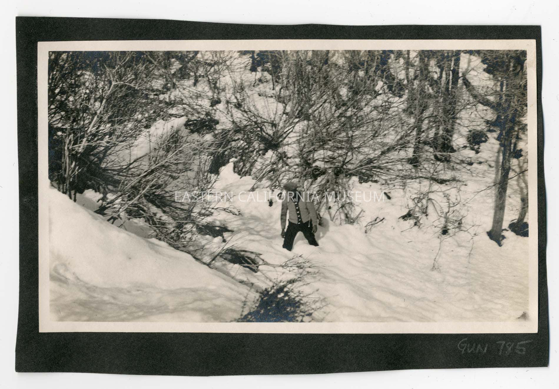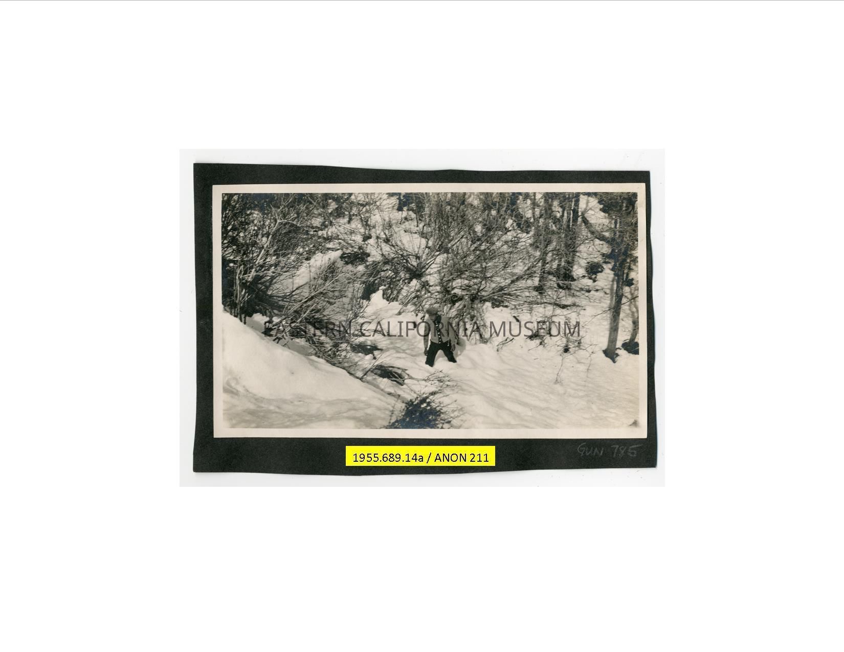 Photo of man standing in a snowy landscape. He may be standing near a river or creek.