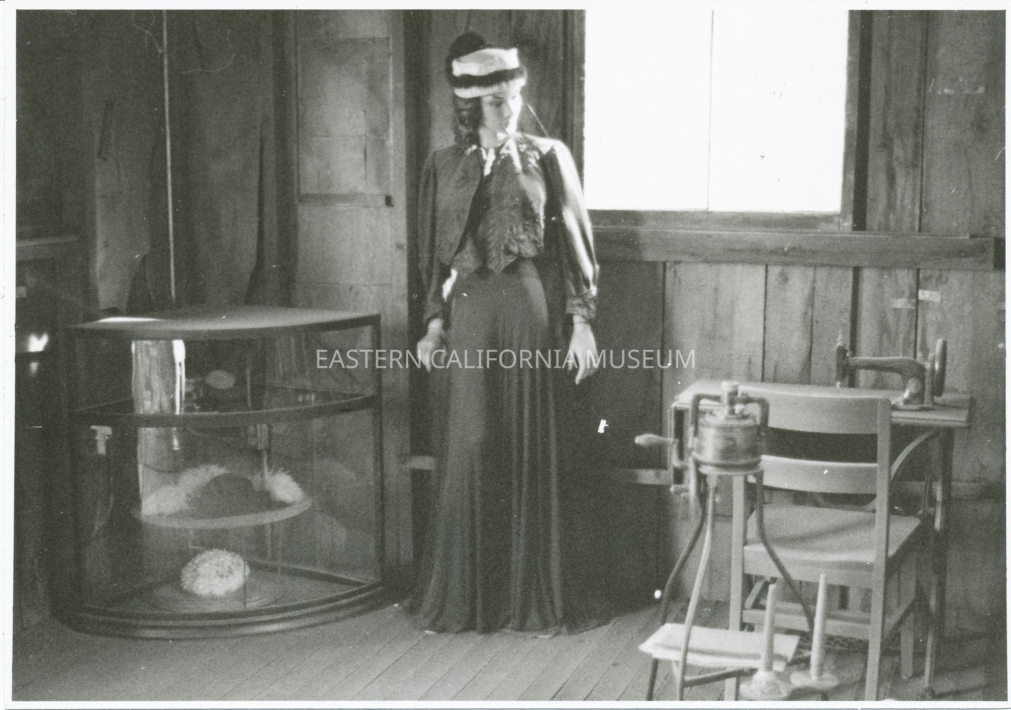 Black and white interior of one of the wood out buildings with the following on display: on left side of image is a vintage pie shaped display case with hats on display. and the top has dust on it; in center is a manniquin dressed in vistage long skirt blouse an jacket all in a dark color plus a light colored hat with a dark band around it. To the right of her is a vintage sewing machine (treddle machine) on a table plus a chair with the back to the camera, Closest to camera is a unknown item with three legs.