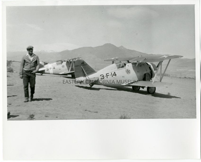 B&W print: photo shows the rear view of 2 bi-planes, man walking in foreground, snowy peaks in background