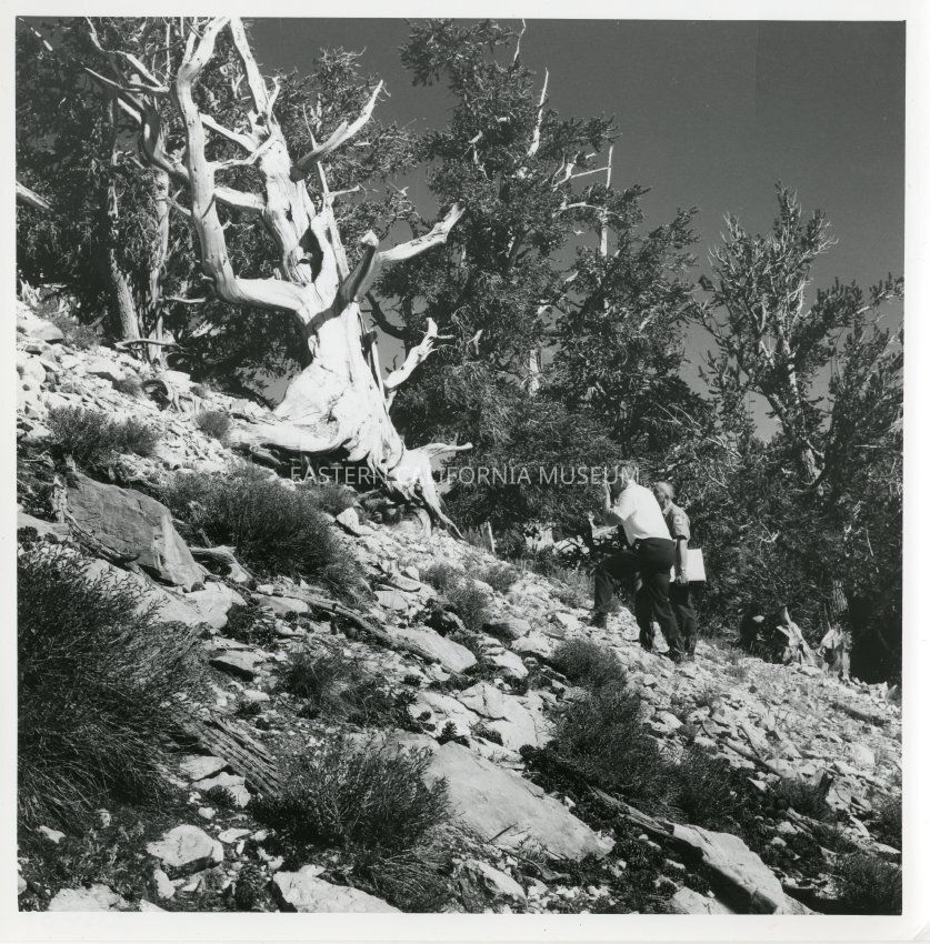 B&W print: 2 men, one man taking a photo of a tree in the Bristlecone Pine Forest