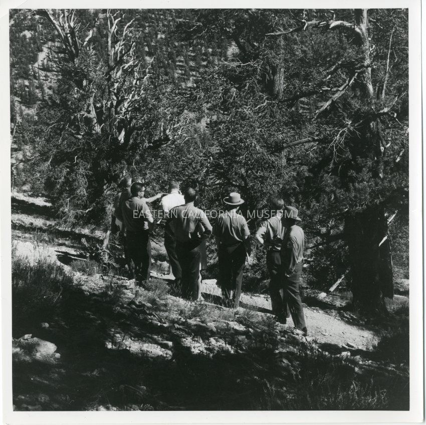 B&W print: several men with back to the camera, standing among bristlecone pines