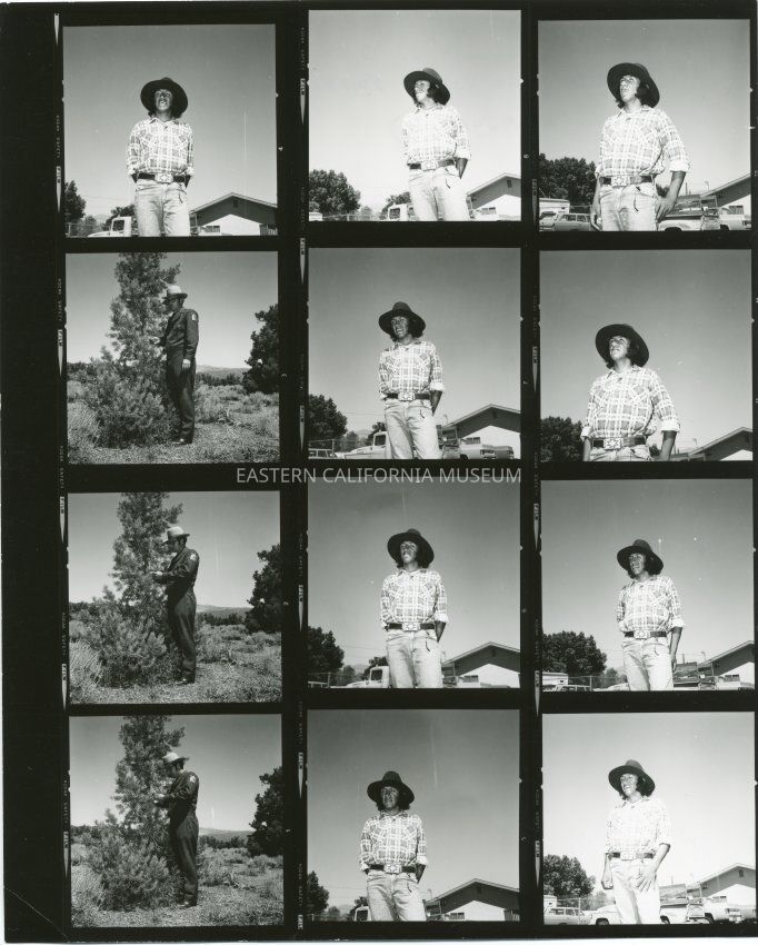 B&W contact sheet: 12 individual photos of a Bristlecone Pine Forest ranger