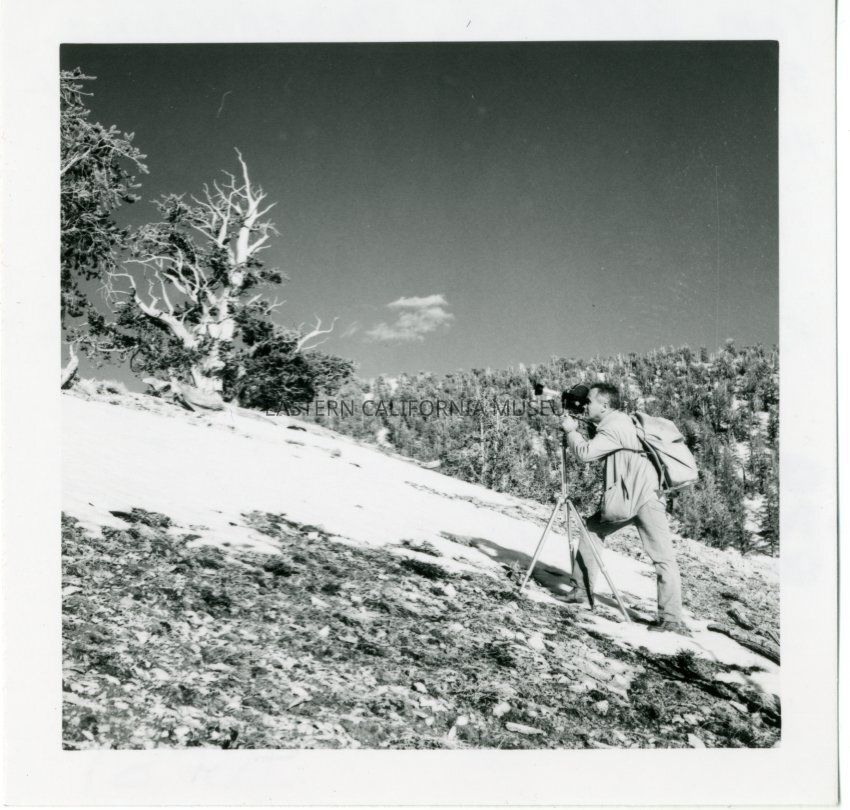 Backside text reads: Tom Beemer photographing Schulman Grove for natural history television shows 1965 photo