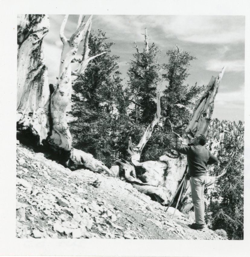 B&W glossy print: man with tripod & camera looking at Bristlecone Pine tree