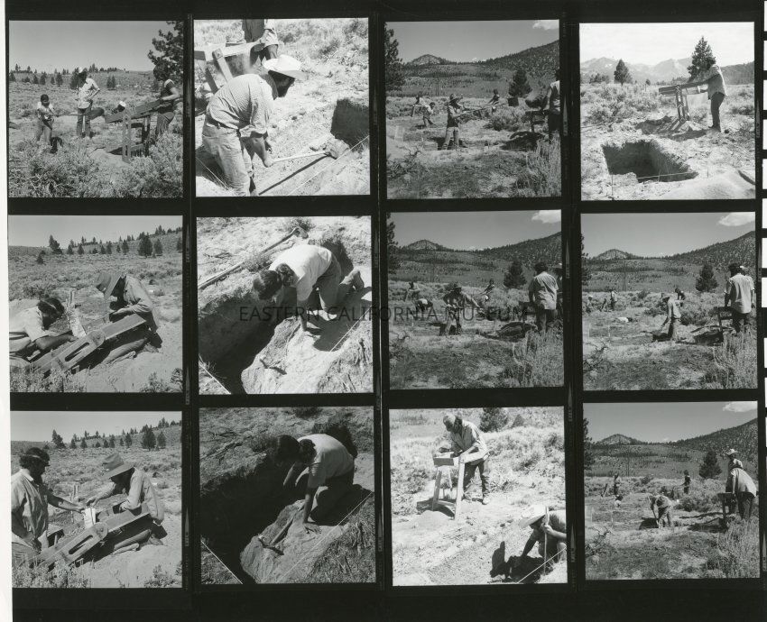 B&W glossy contact sheet: 12 individual photos all showing people actively working archaeological digs