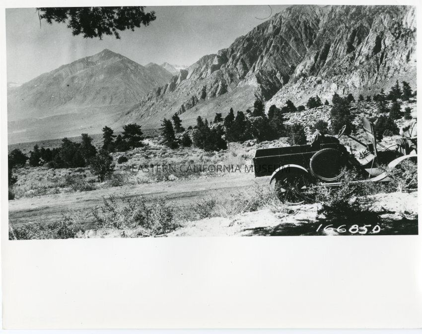 B&W glossy print: early model truck type auto parked on dirt road; Mount Tom in background; near Bishop, California