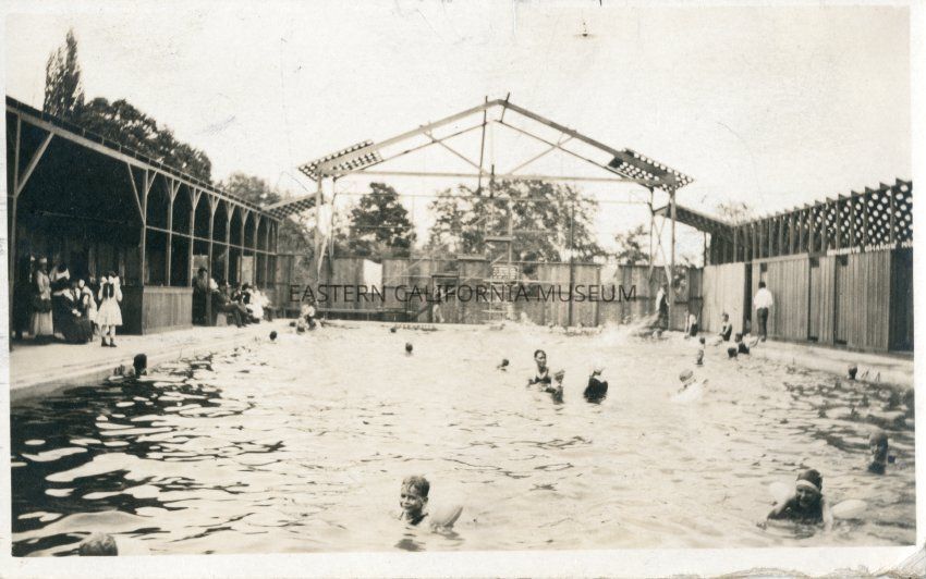 Sepia post card: Keoughs swimming pool, Bishop area, numerous bathers in the pool