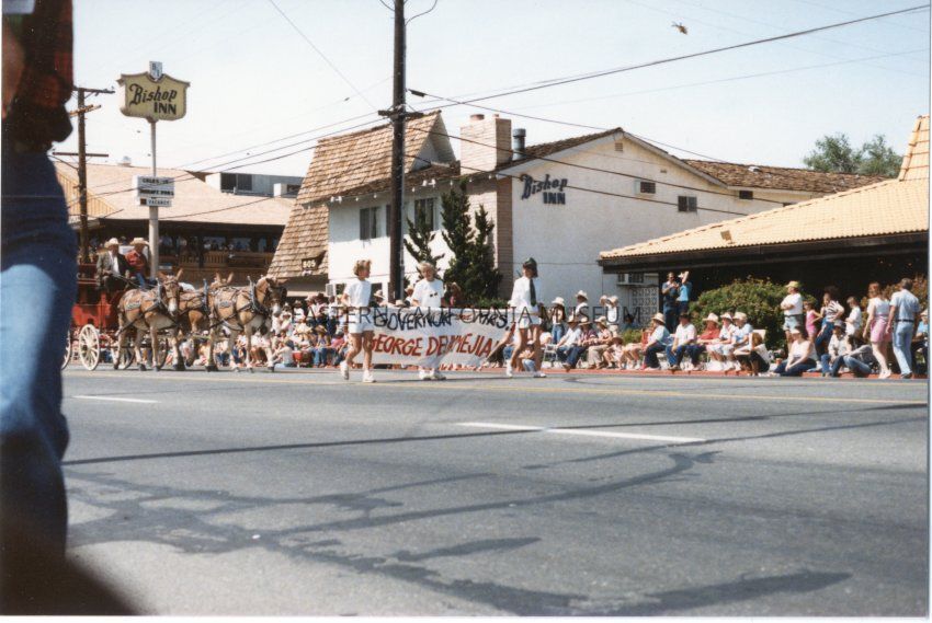 Color print: first in series of 9 photos - Bishop Mule Days Parade May 30, 1986 - street scene - girls carrying banner "Governor and Mrs. George Deukemejian" , wagon pulled by mules - business sign "Bishop Inn" on side of street
