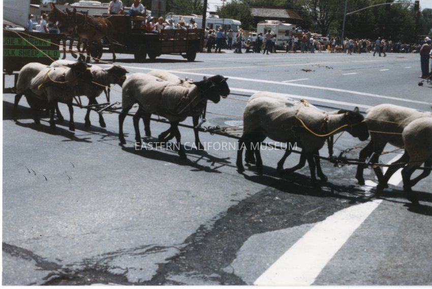 Color glossy print: third in series of 9 photos - team of sheep in Bishop Mule Days Parade May 30, 1986: series of photos comes with typed script