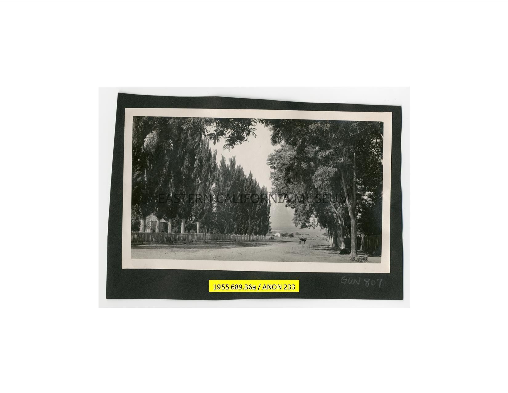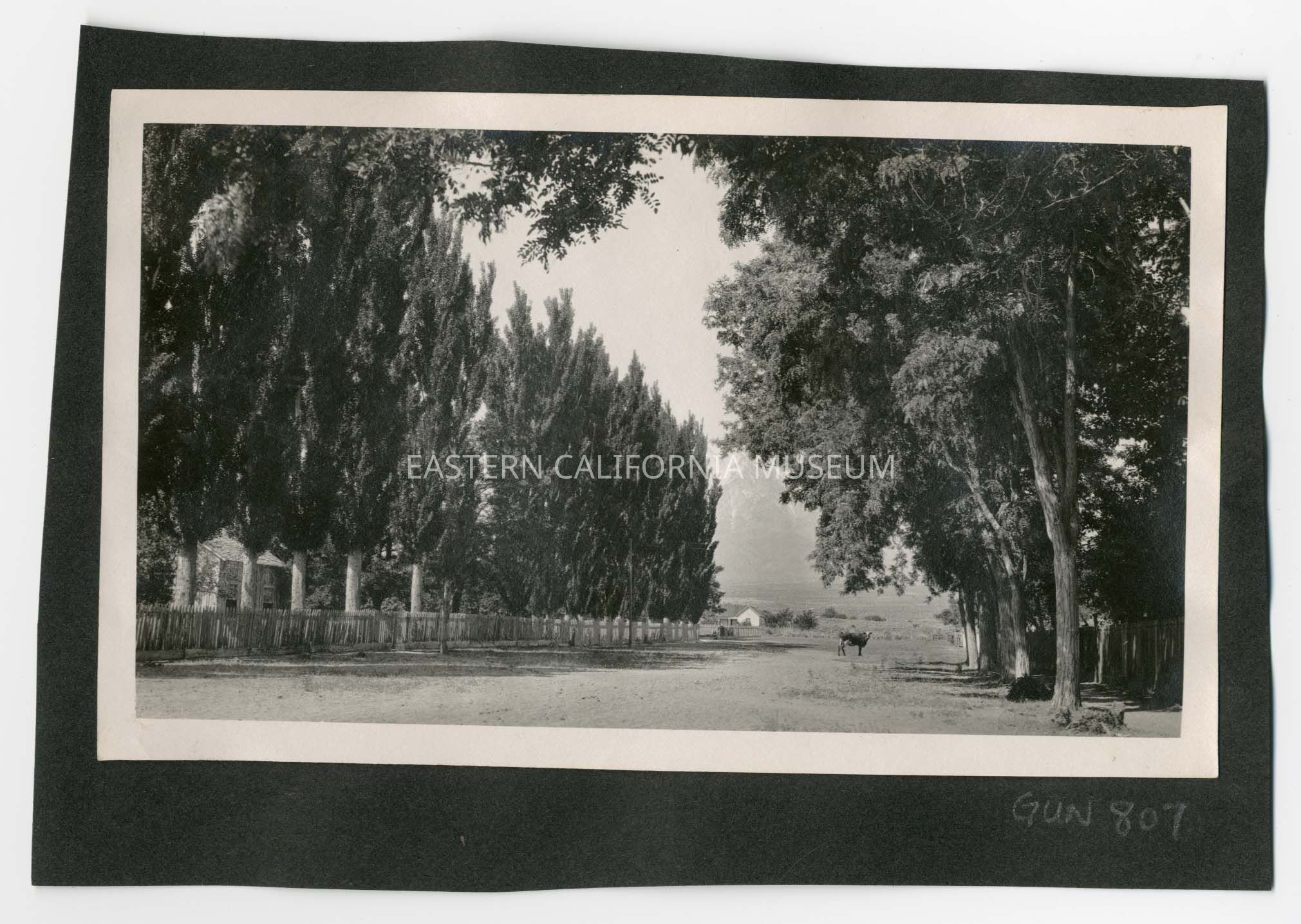 Photo taken looking down a dirt street lined by fences and rows of trees towards the Sierra Nevada mountain range. There is a loose cow in the middle of the street. Location is probably Independence.