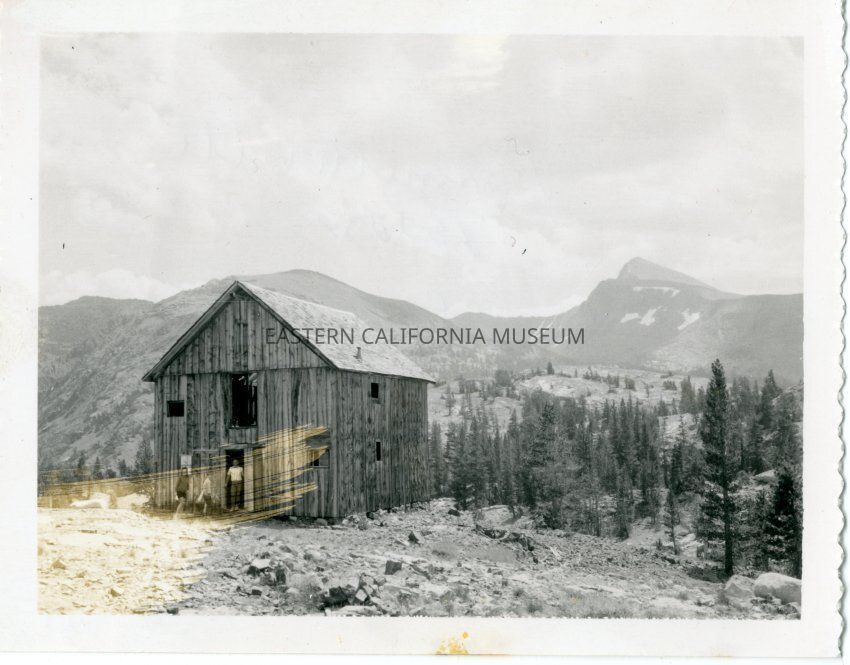 B&W glossy print: photo w/ scalloped edges, building at Bennettville , ghost town near Tioga Pass and Yosemite National Park , 3 people in front of building
